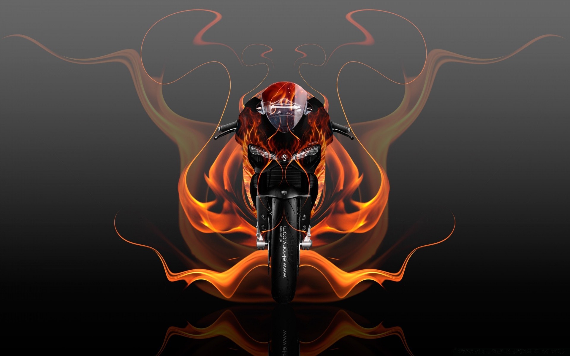 A powerful motorcycle with abstract flames on a gray backgroundA powerful motorcycle with abstract flames on a gray background