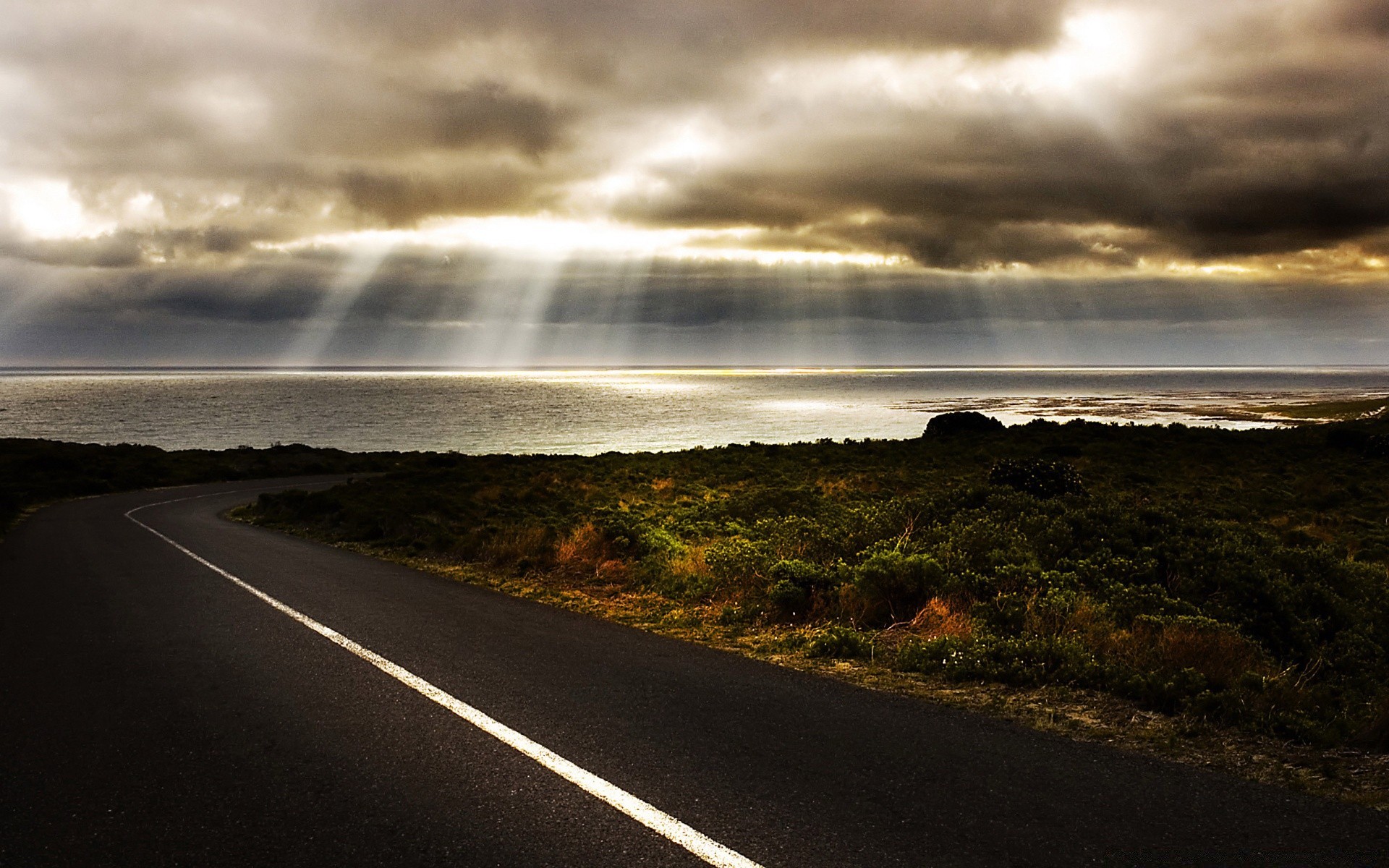 Black and white landscape bench and highway in the foreground behind a lot of stones at the top of the sky with clouds