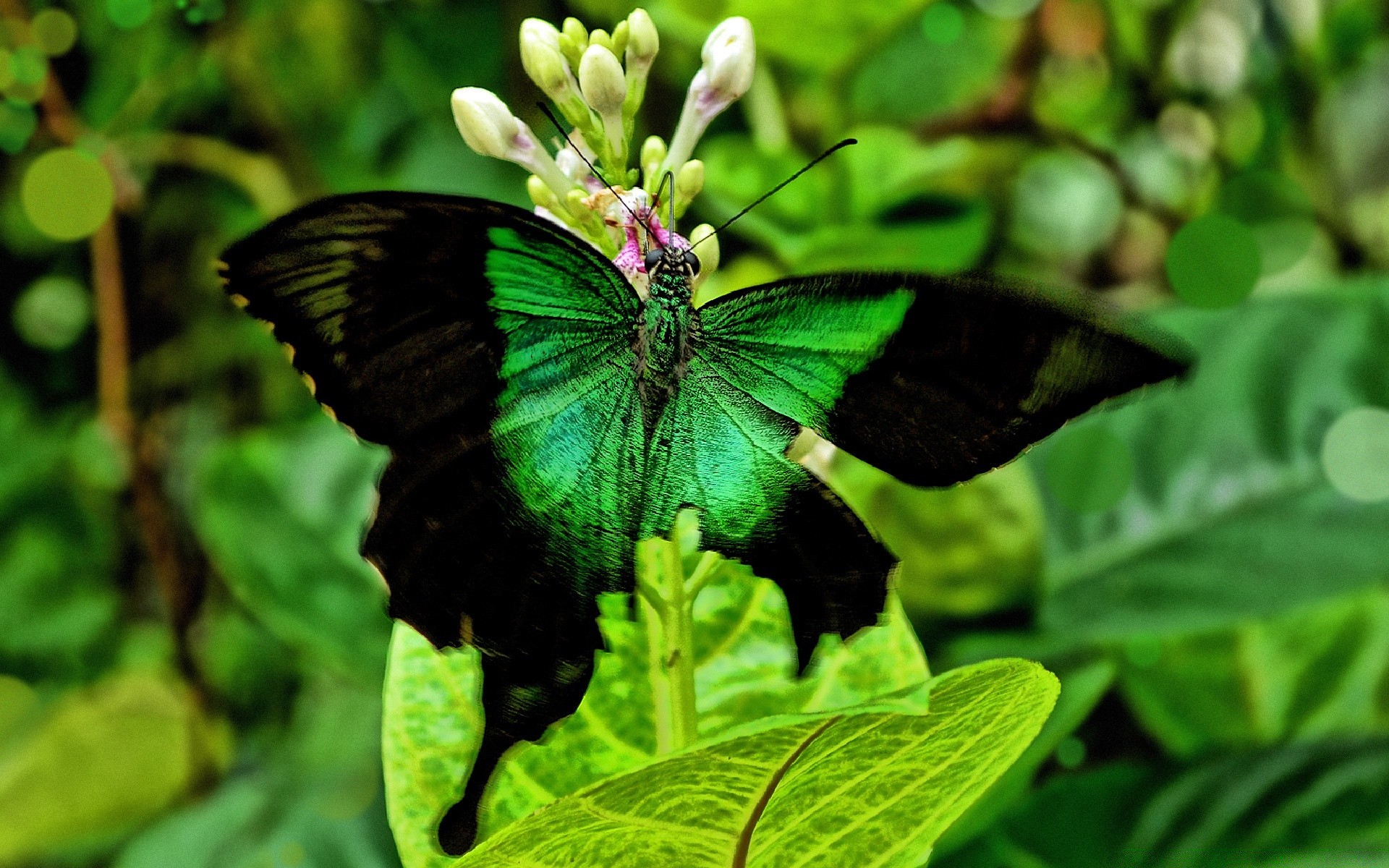 A green butterfly on green leaves. Summer. Juicy greens