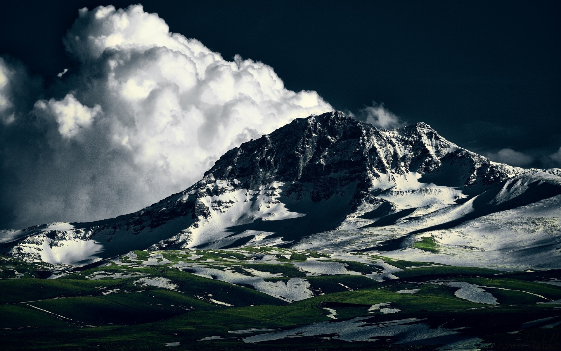 Yellow purple flowers next to the stones at the foot of the mountain on the background of a non-foggy cloud