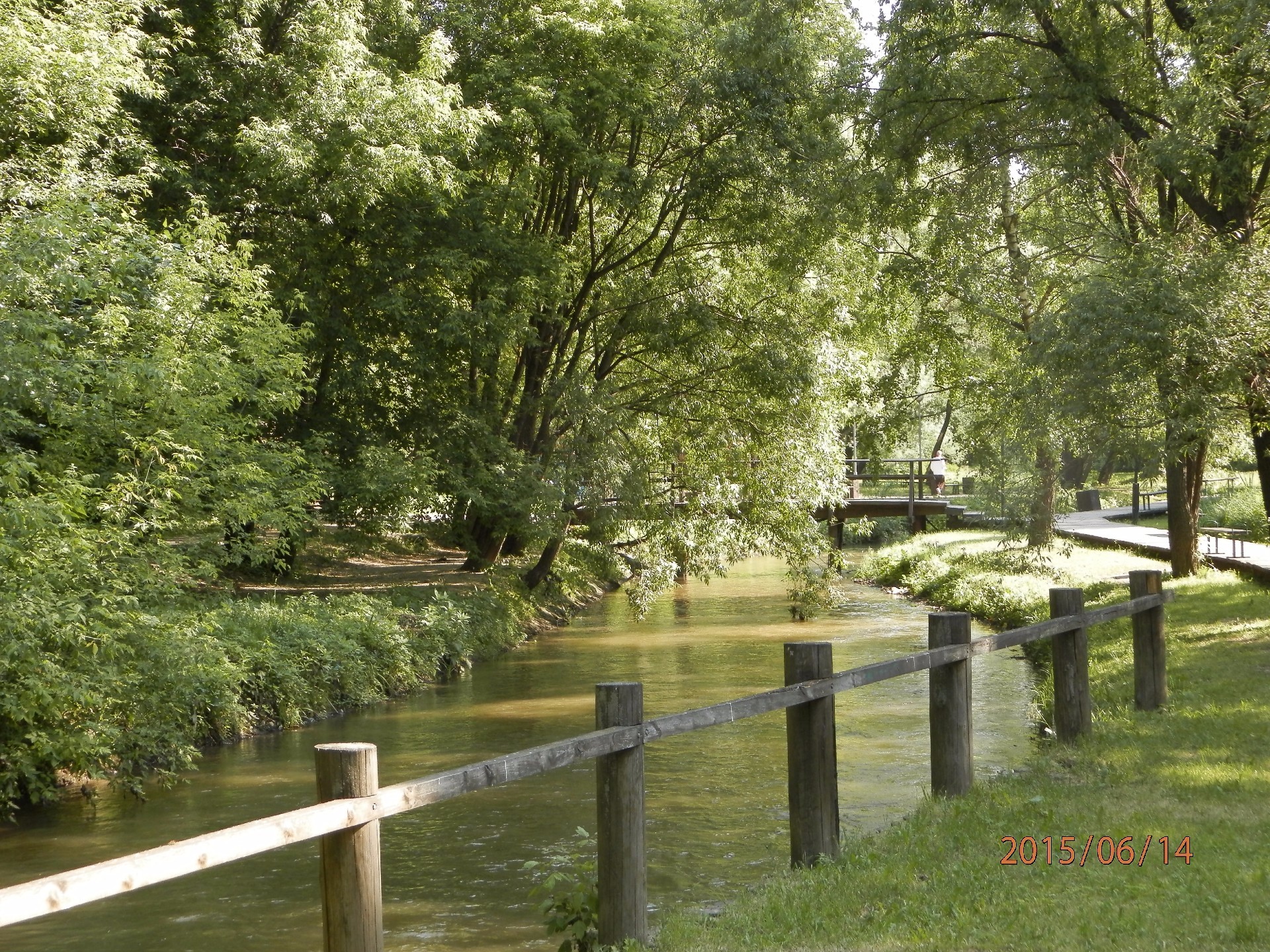 A carpet of yellow leaves post shafts in dark thick trees with large crowns