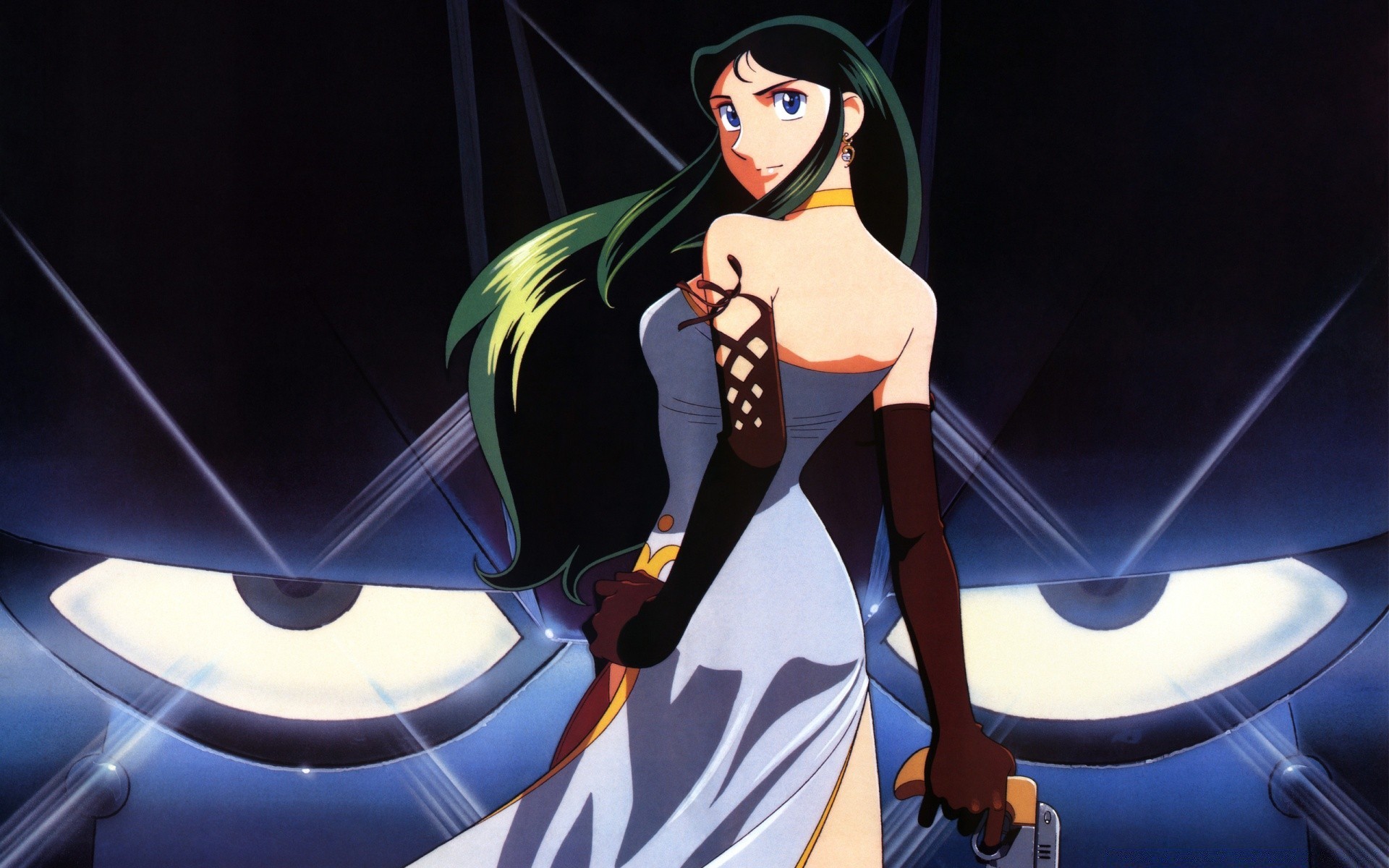 Huge evil eyes. A girl singer with long hair. Anime