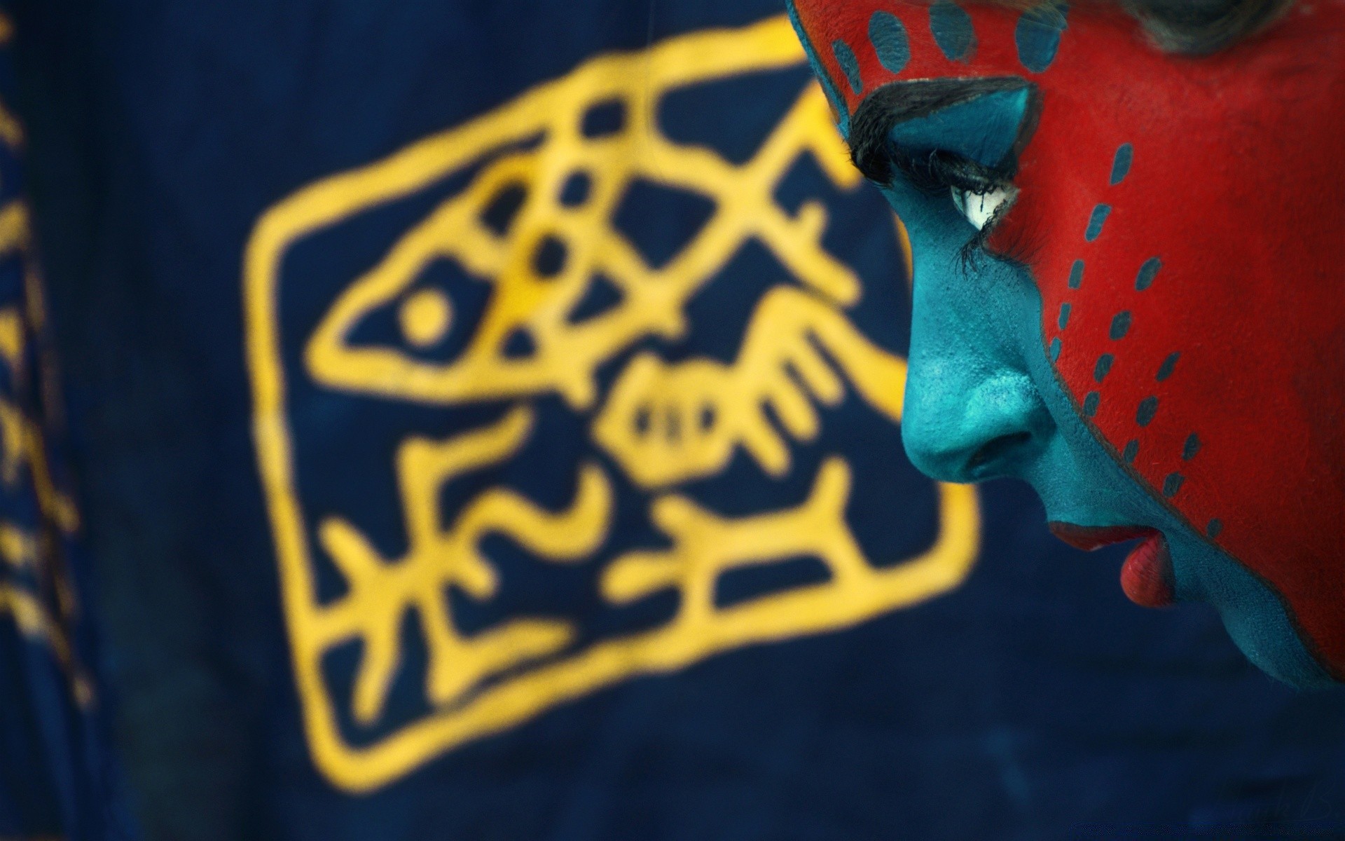 A girl with a painted face on the background of a yellow symbolA girl with a painted face on the background of a yellow symbol