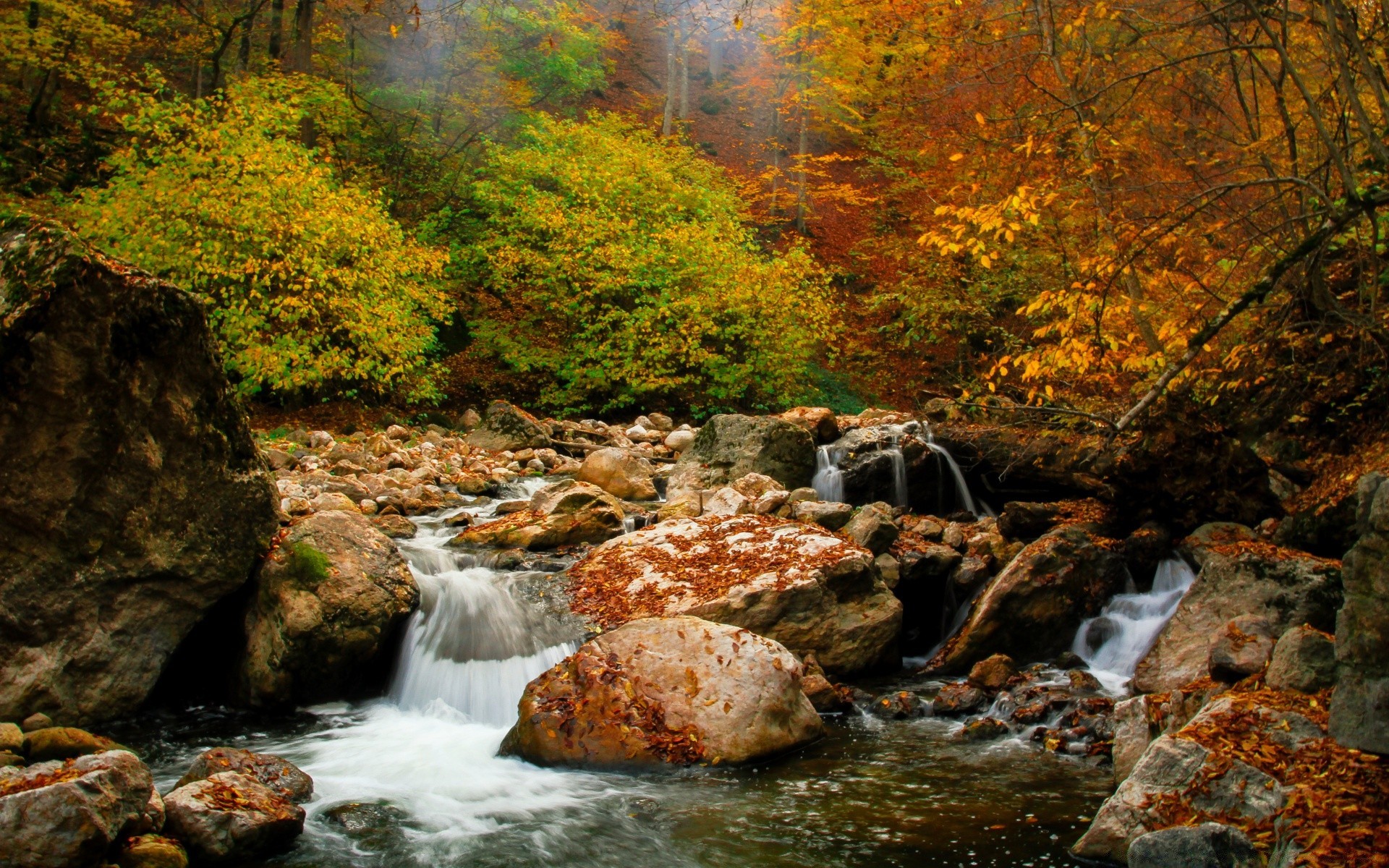 A small waterfall among rocks and yellow-green leaves of trees in the autumn forest