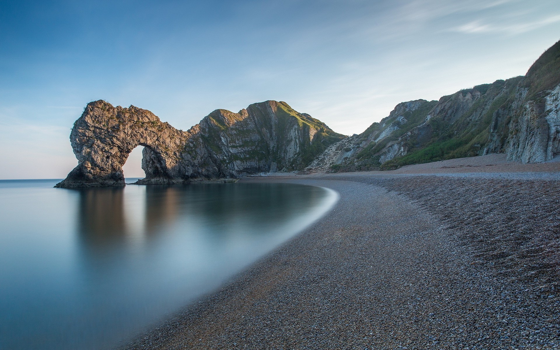 View of the flowing sea surface beyond the edge of the evening horizon, two lonely rocks look at each other