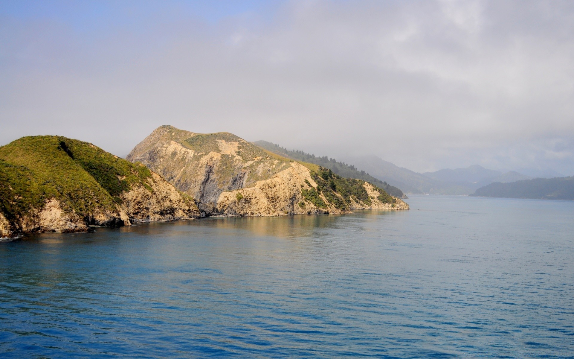 A mountain by the water in the morning haze