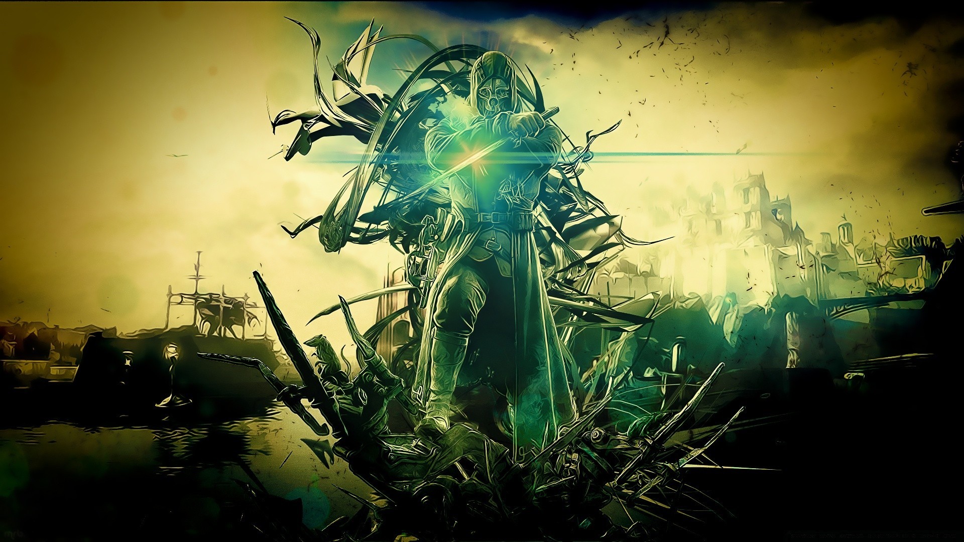 A picture from the movie on the background of a man with a sword