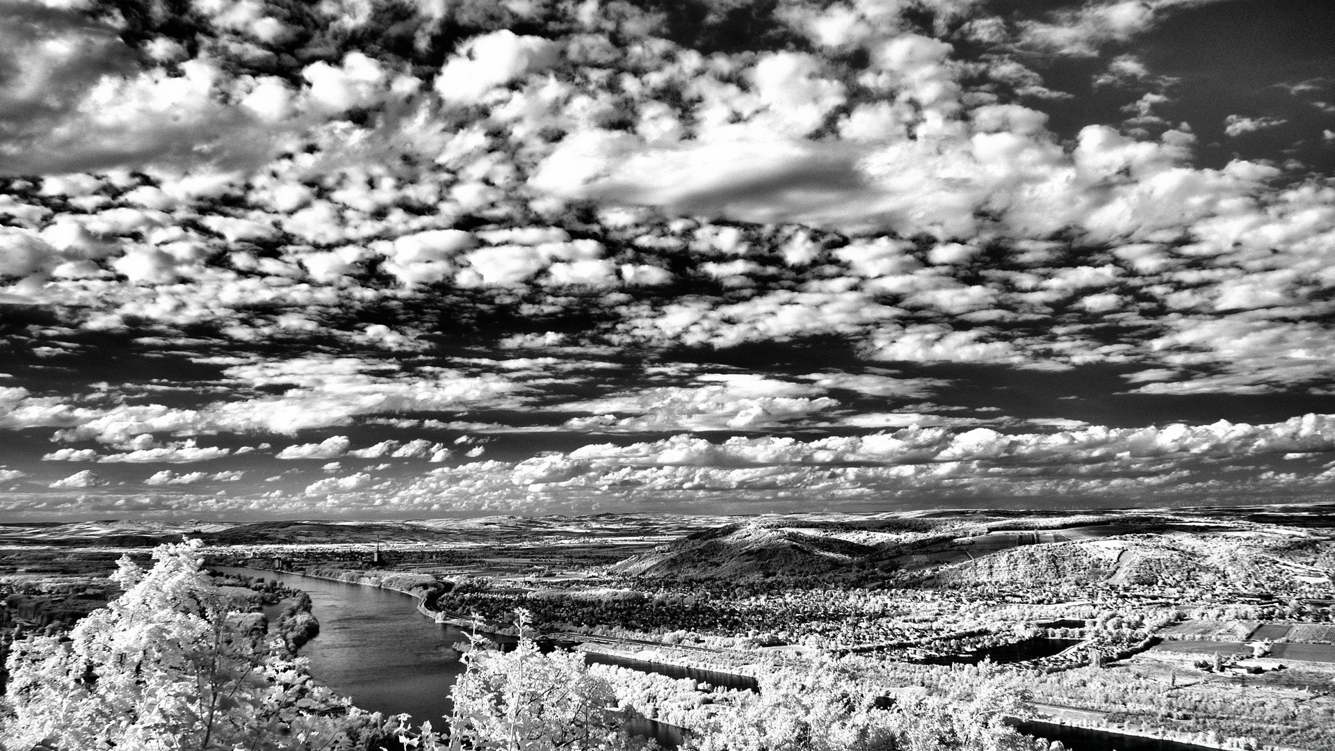 Black and white photo of the landscape in winter river and hills from a height