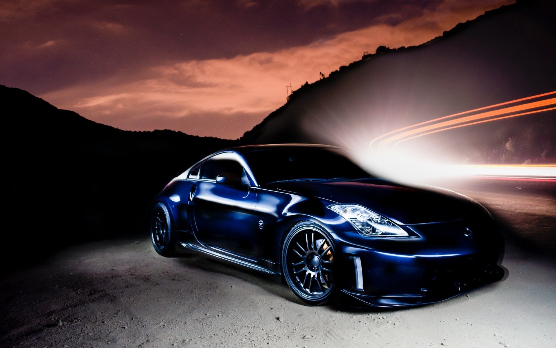A Nissan car on the road in a crimson sunset