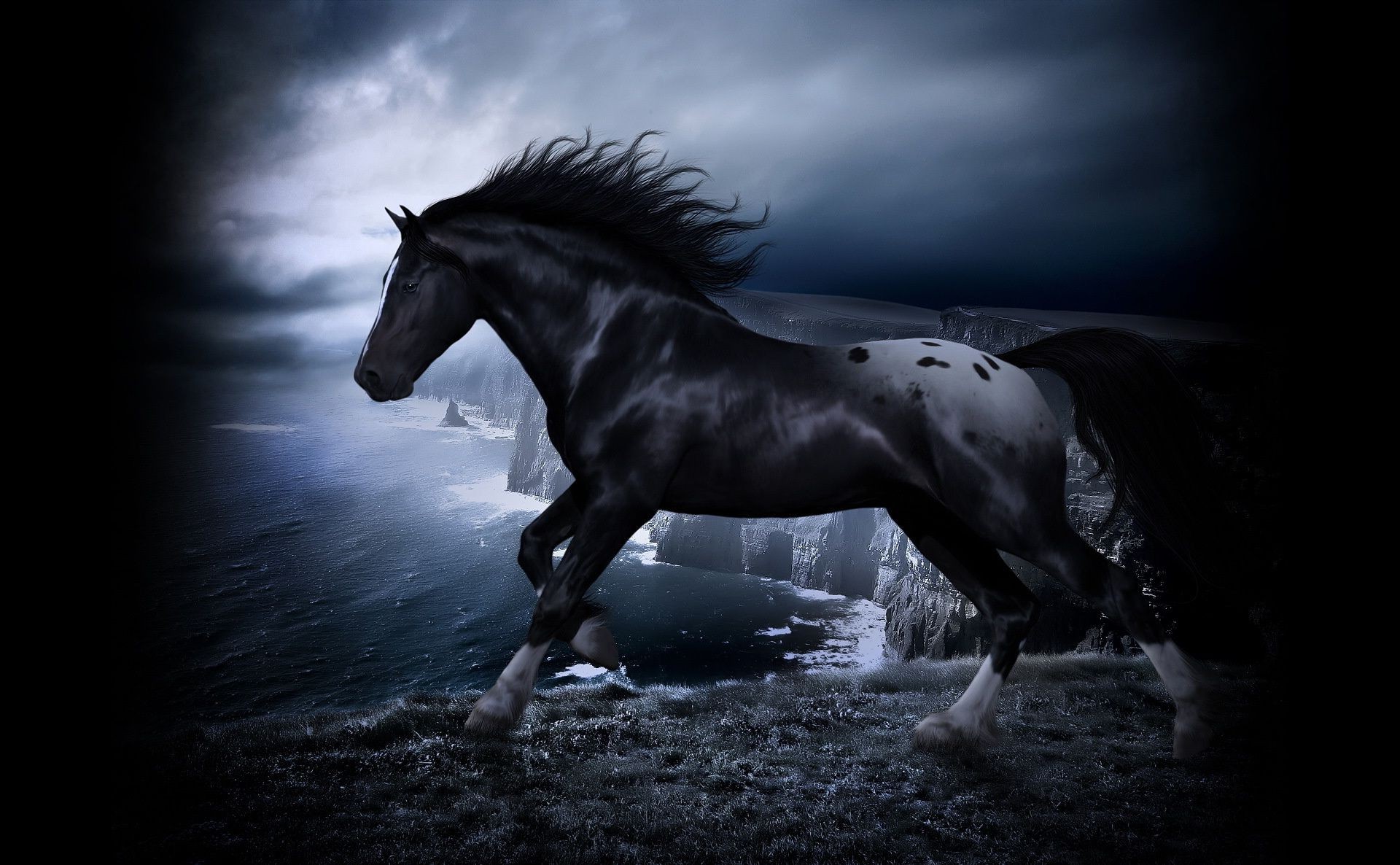 A black horse on a dark background