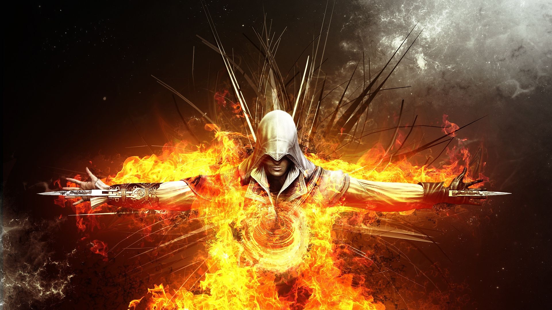 A male warrior against the background of fire and smoke. Fantasy image on a dark background