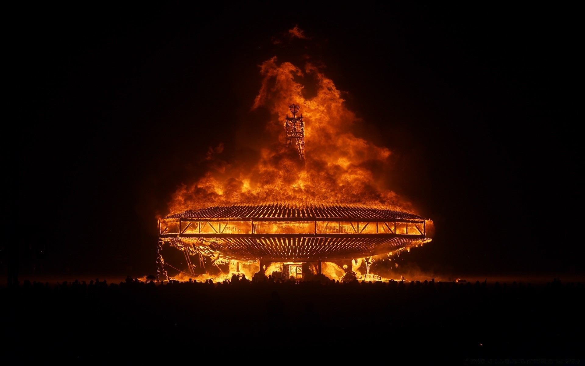 A huge building is burning at night