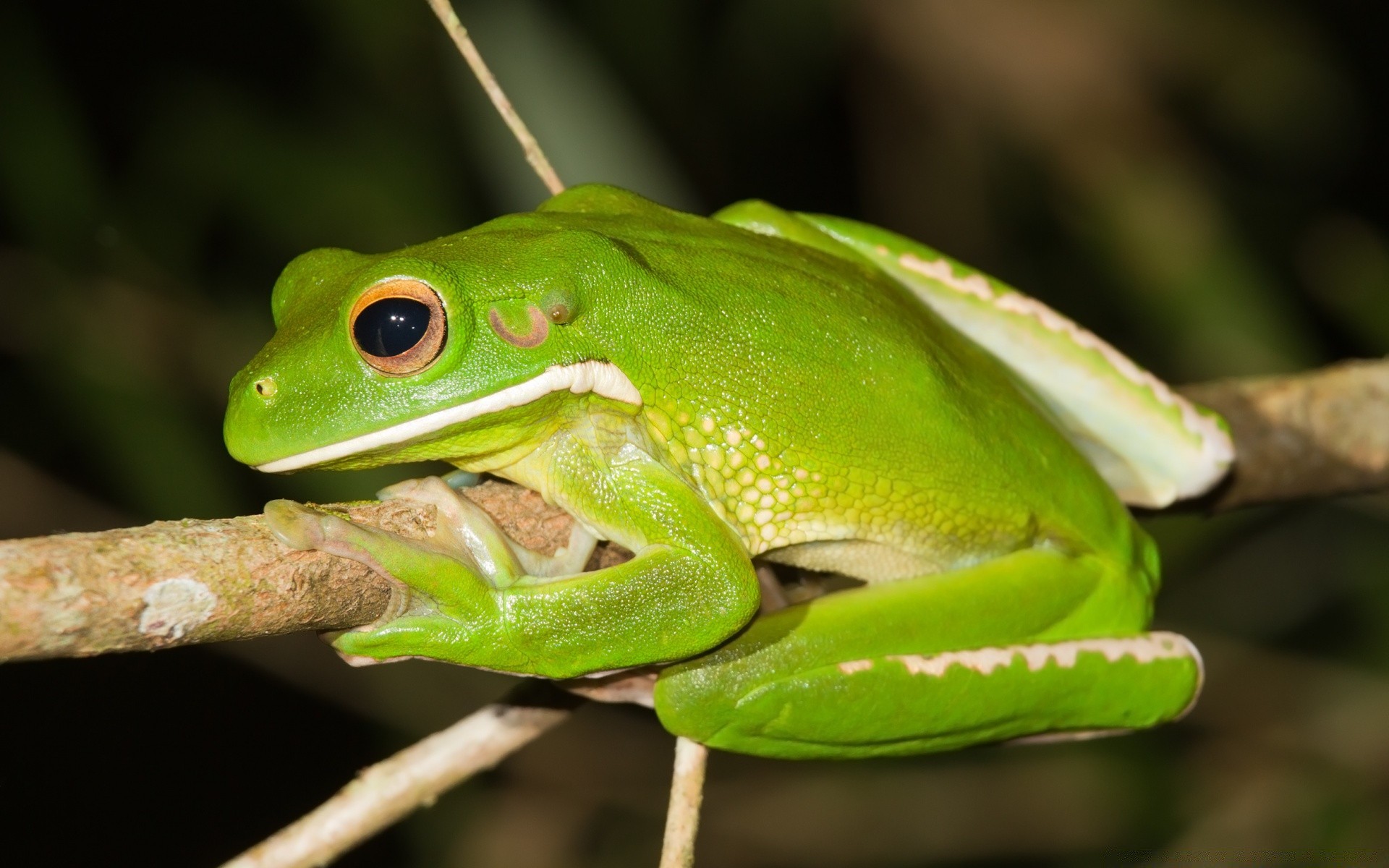 A green frog is hanging on a branch