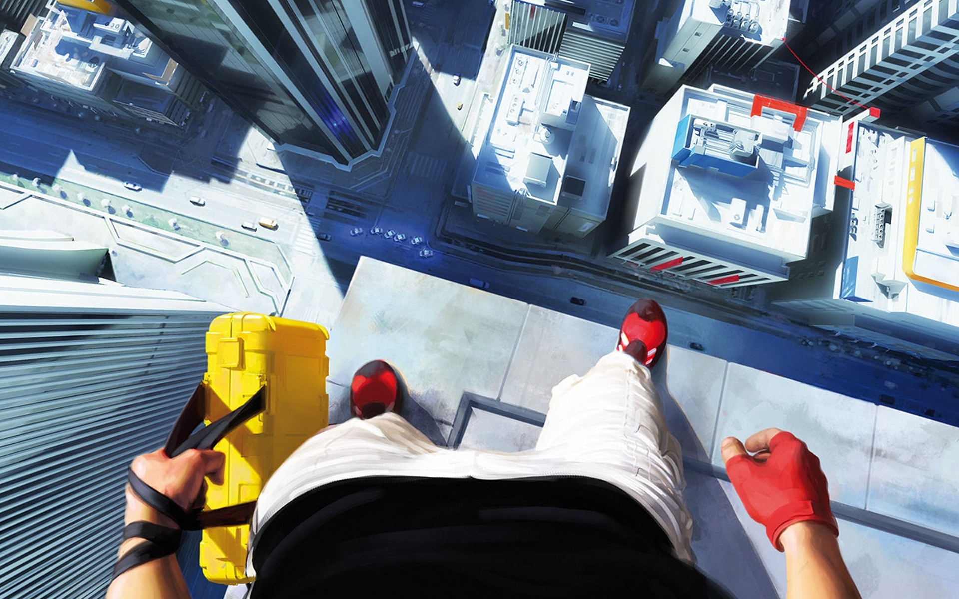 A man on the edge of a skyscraper with a briefcase in his hands