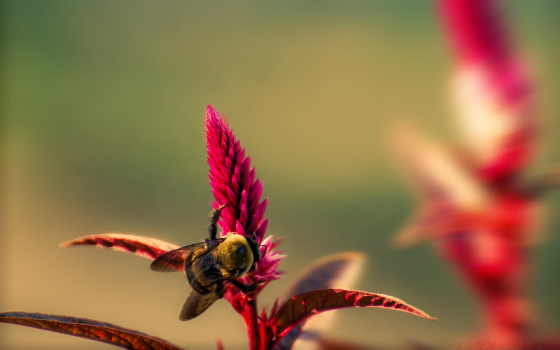 An insect sits on a pink flower