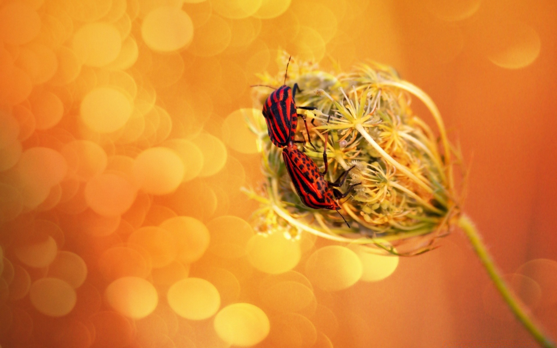 A red insect on a dandelion on an orange backgroundA red insect on a dandelion on an orange background