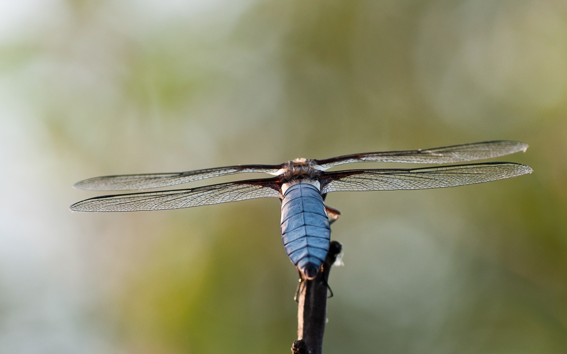A blue dragonfly sat on the edge of a branch