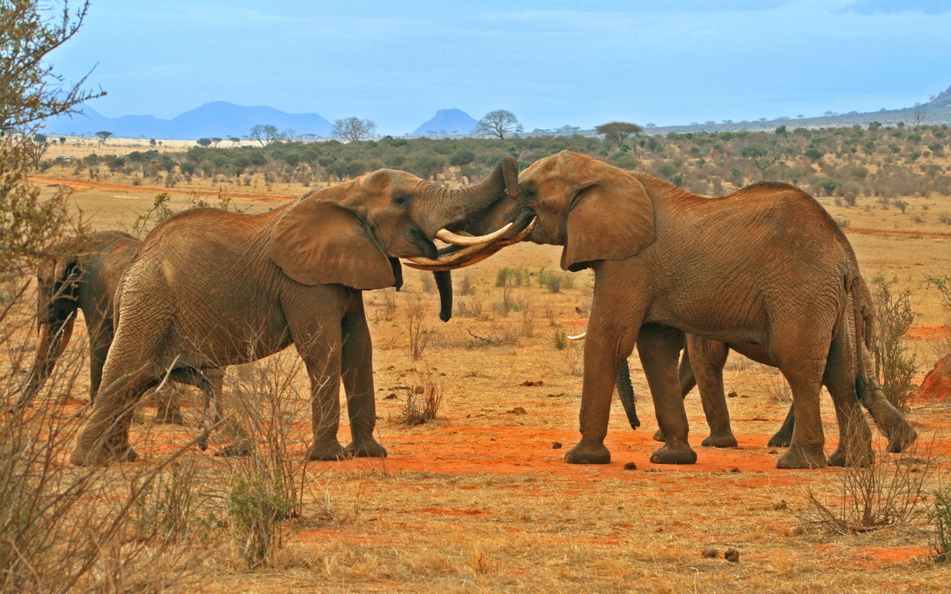 A herd of elephants against the background of the nature of the savannah