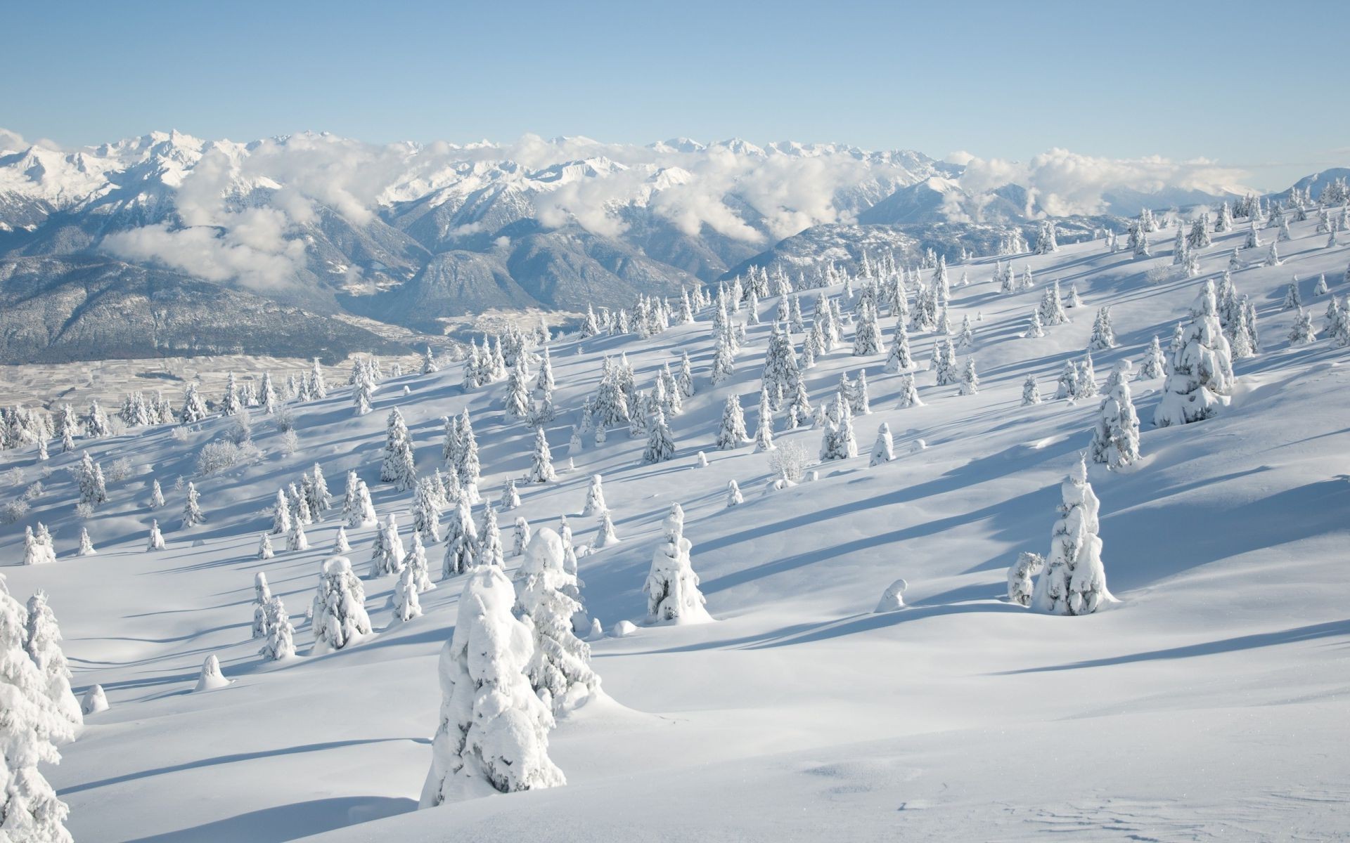 Mountains and Christmas trees covered with snow