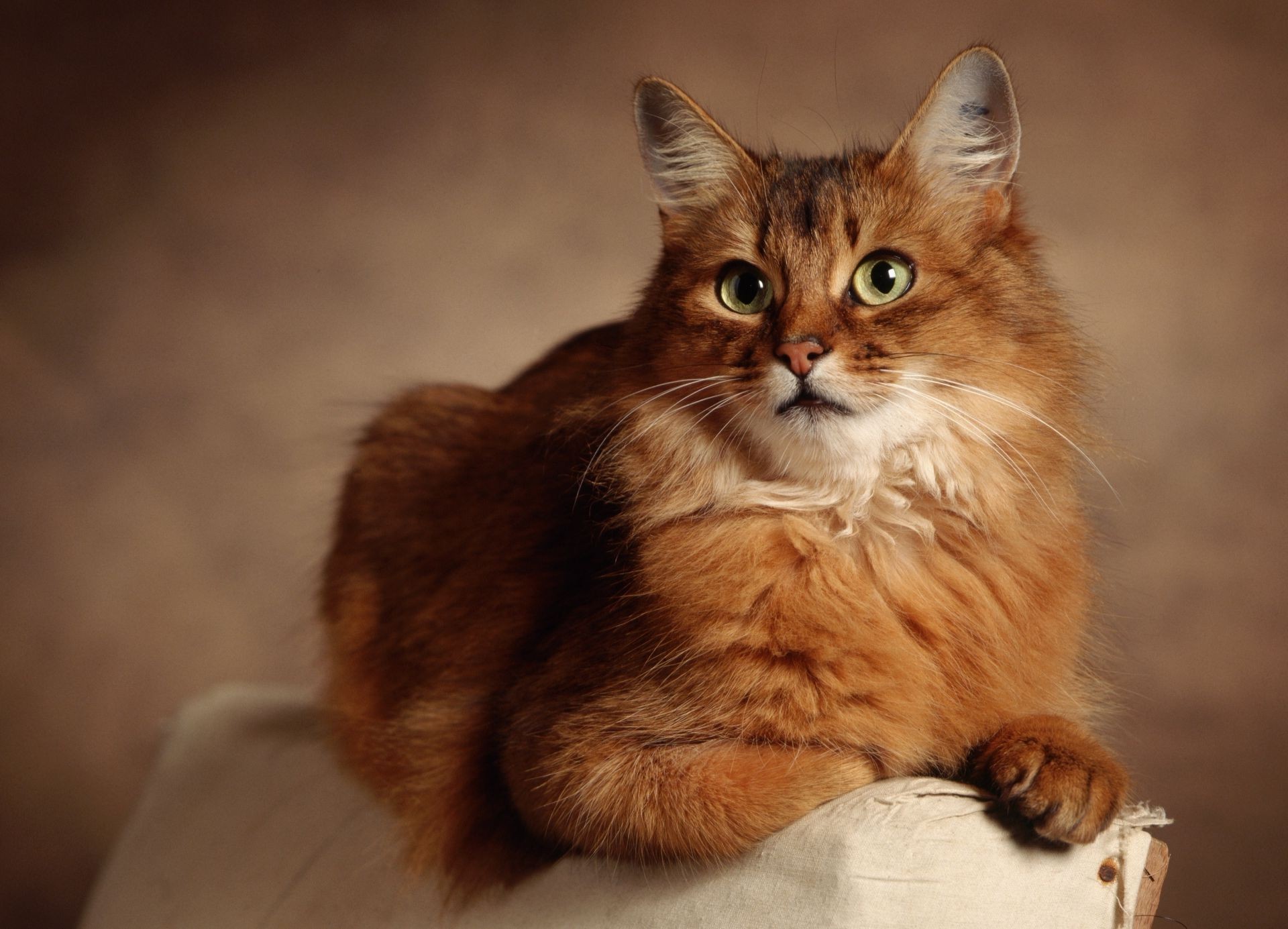 A red fluffy cat with a bushy mustache looks somewhere