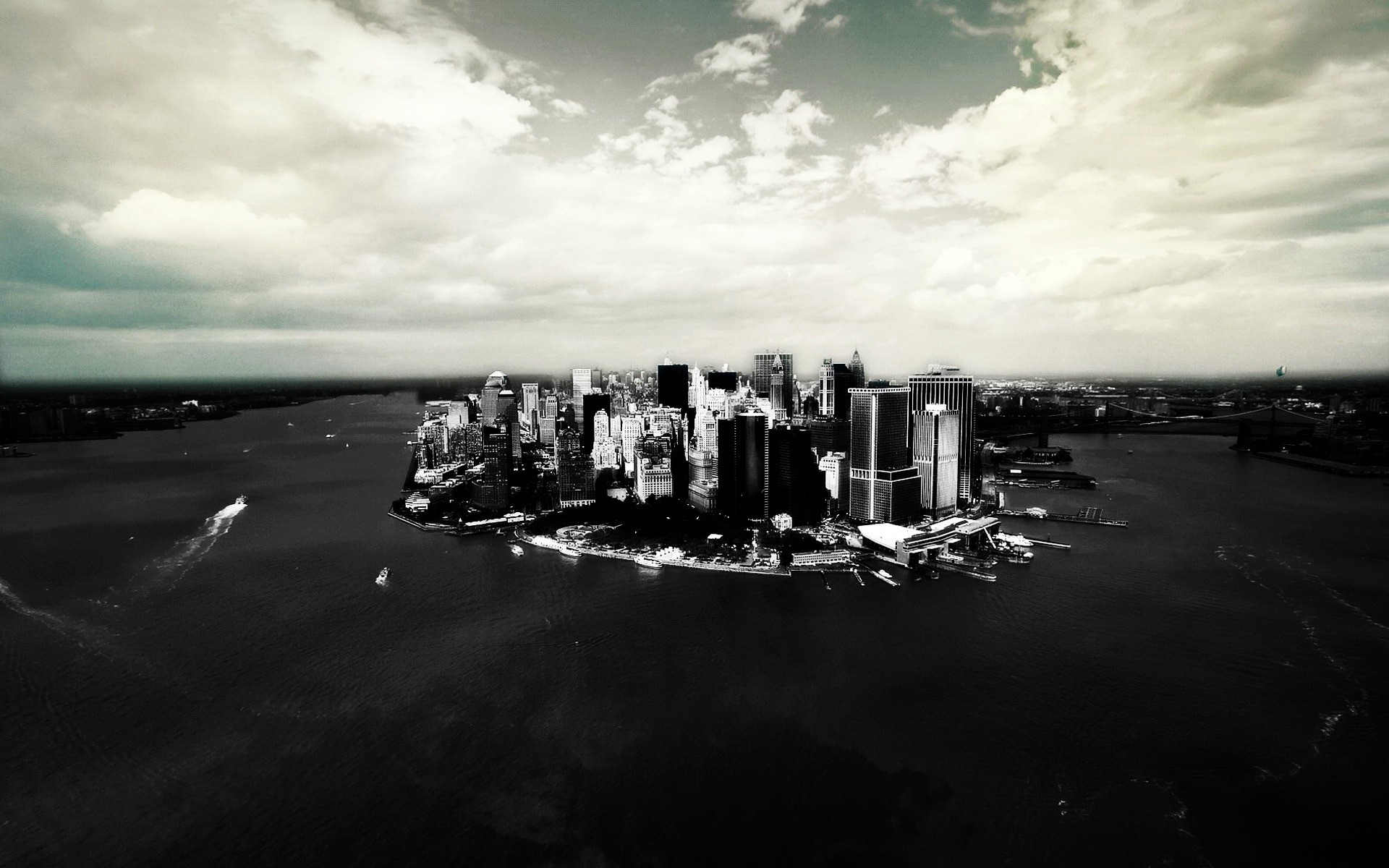 Monochrome photo of a city surrounded by water