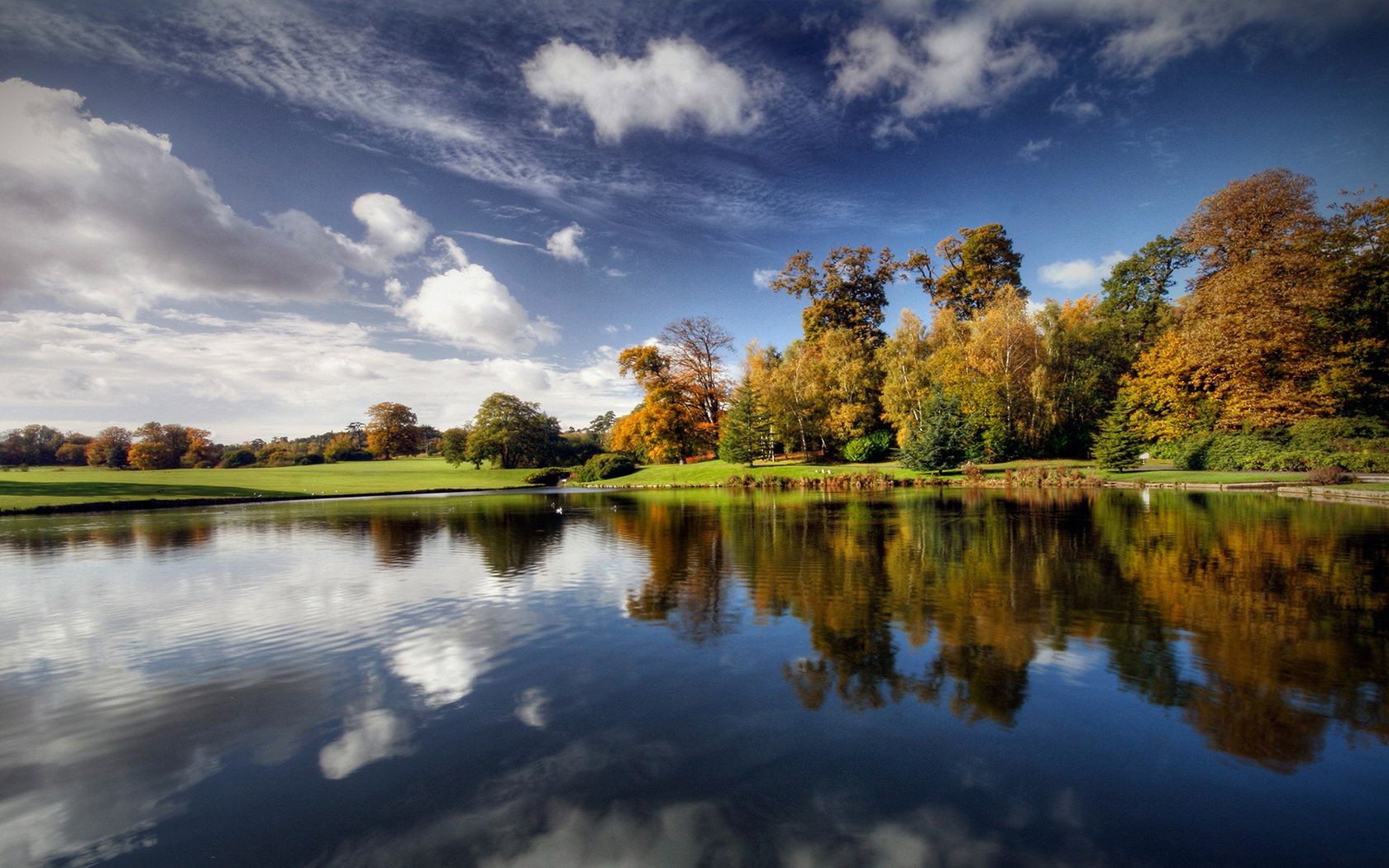 Mirror lake reflecting white clouds