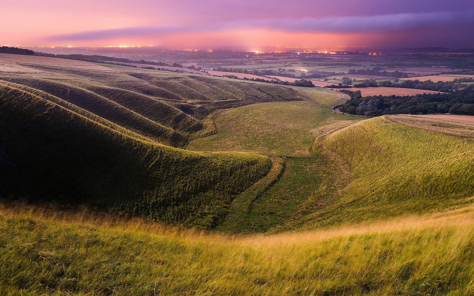A landscape of mountainous terrain with a gloomy sky and a rainbow