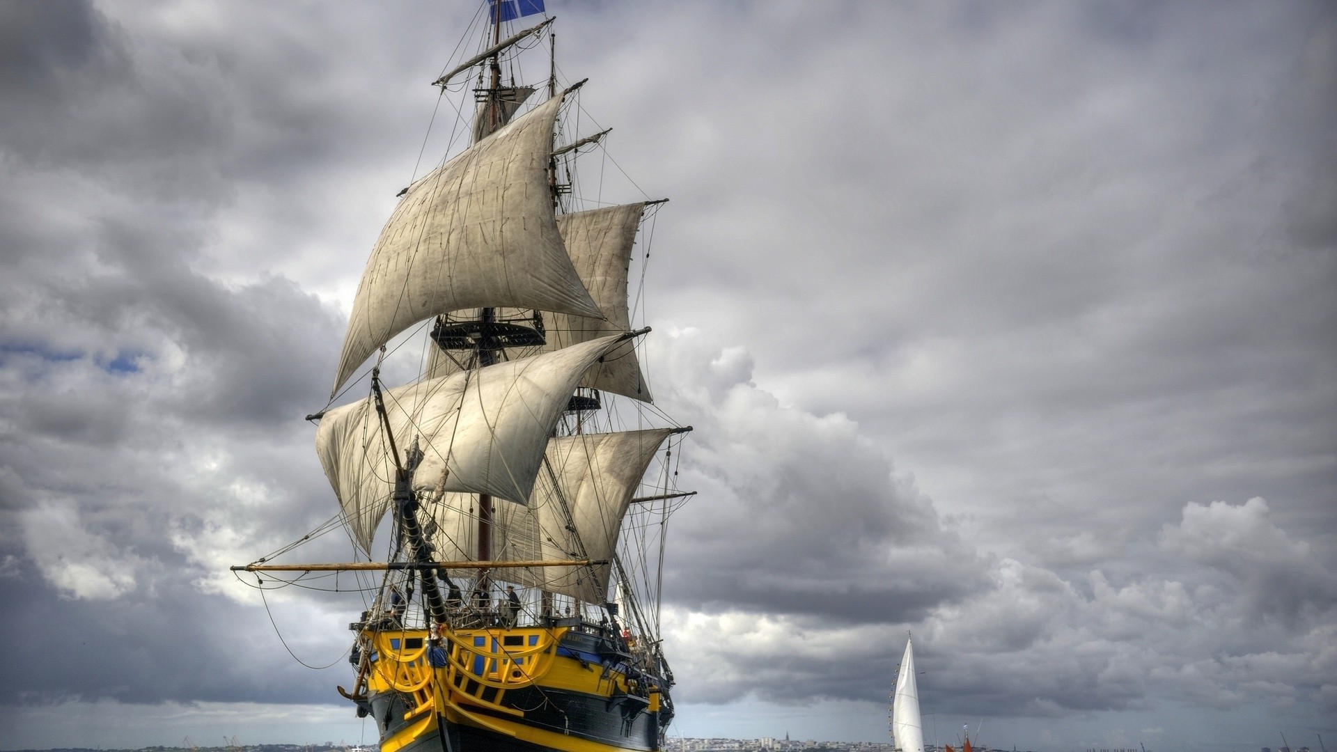 A large sailing ship is sailing on the sea