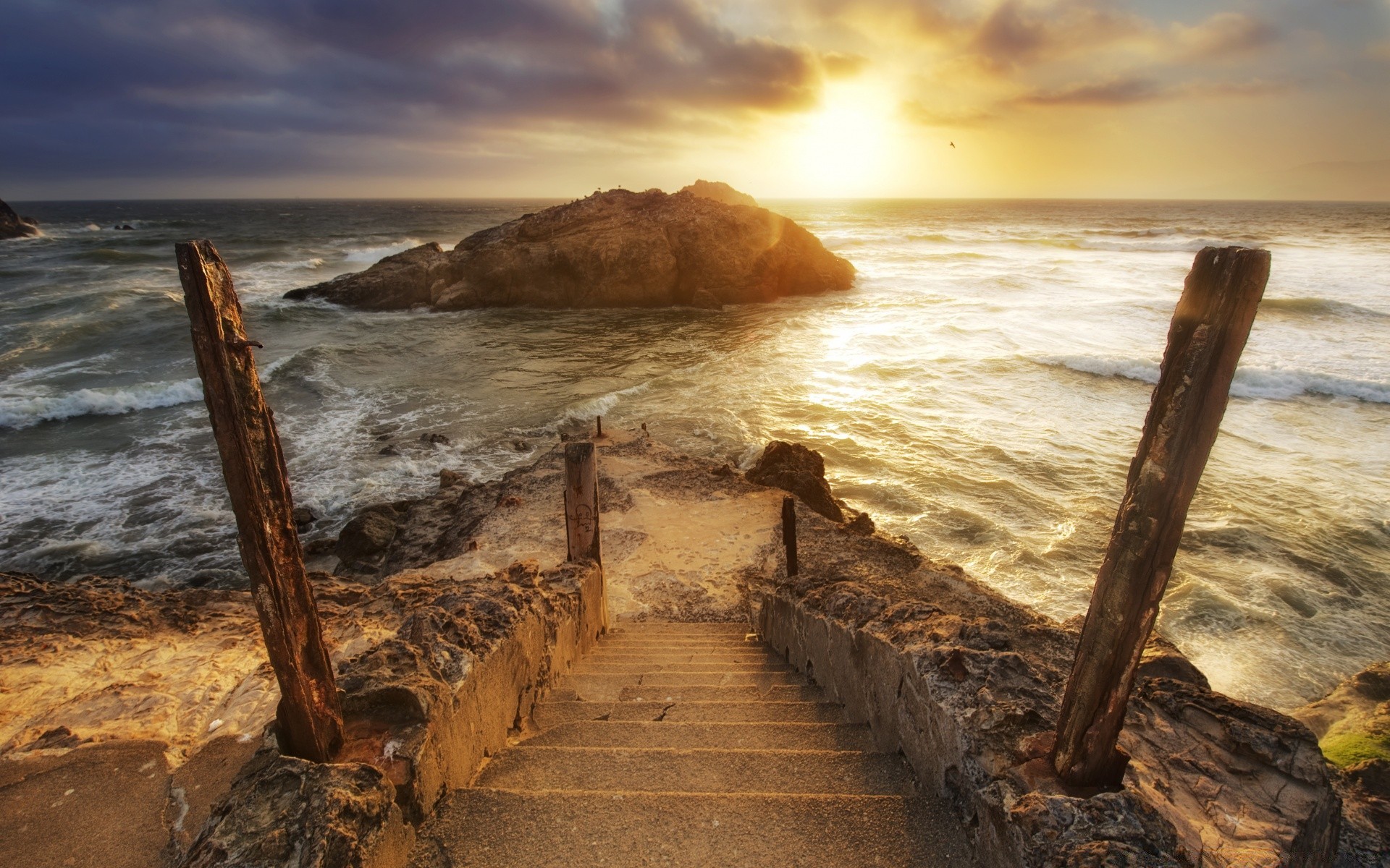 Country descent down the stairs to the sea during sunset