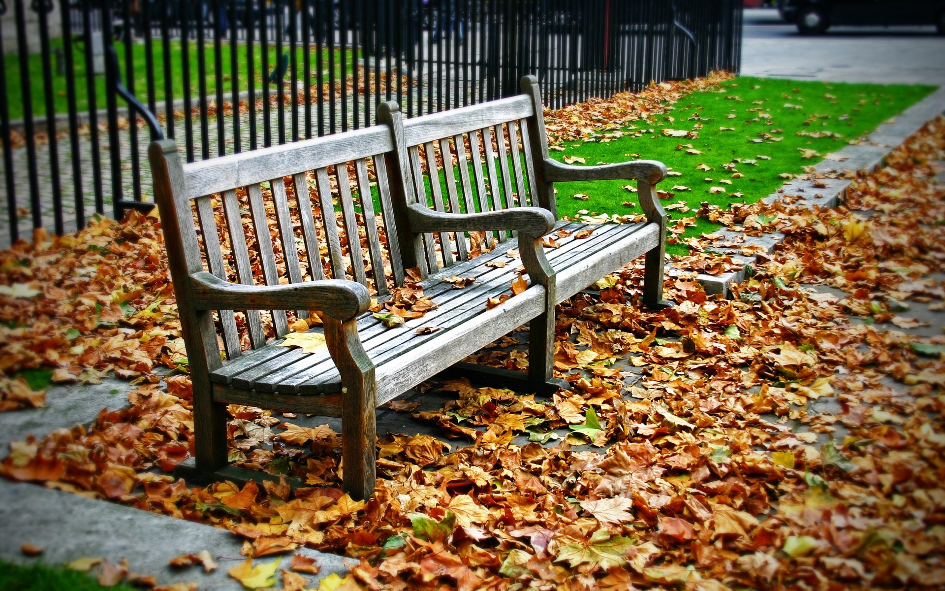 Park bench on the background of autumn landscape