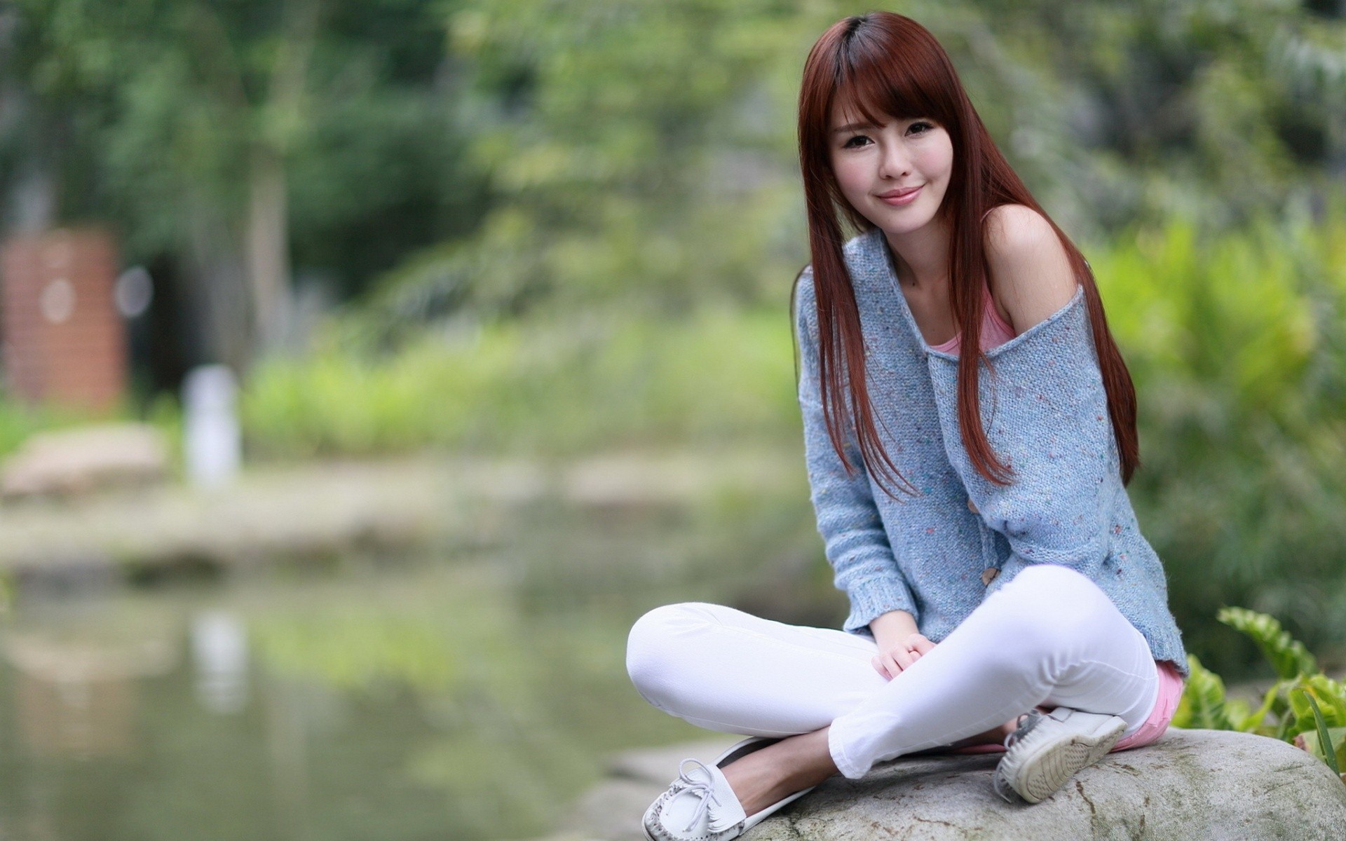 A girl with long hair is relaxing outdoors