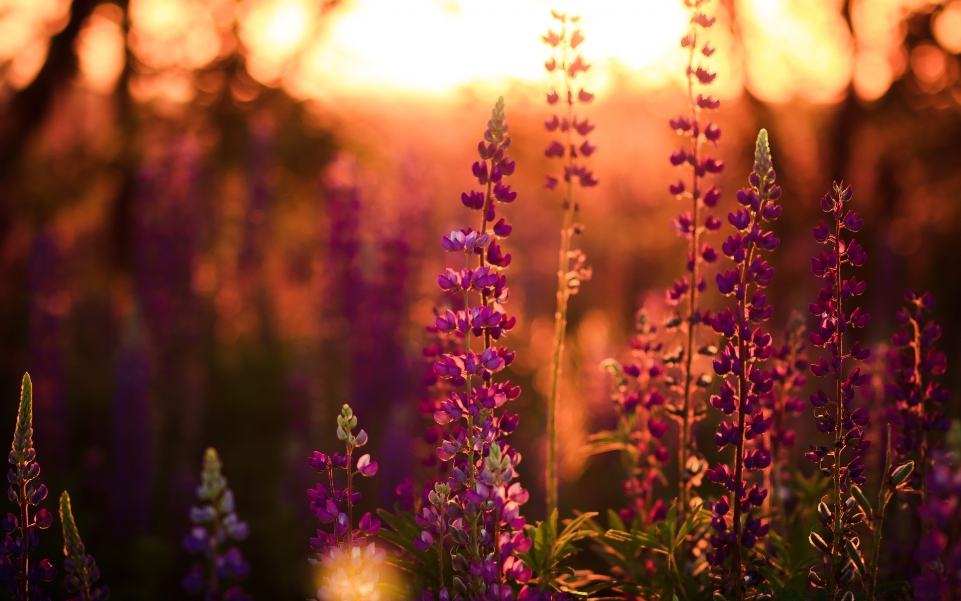 Dawn on the background of a field with flowers