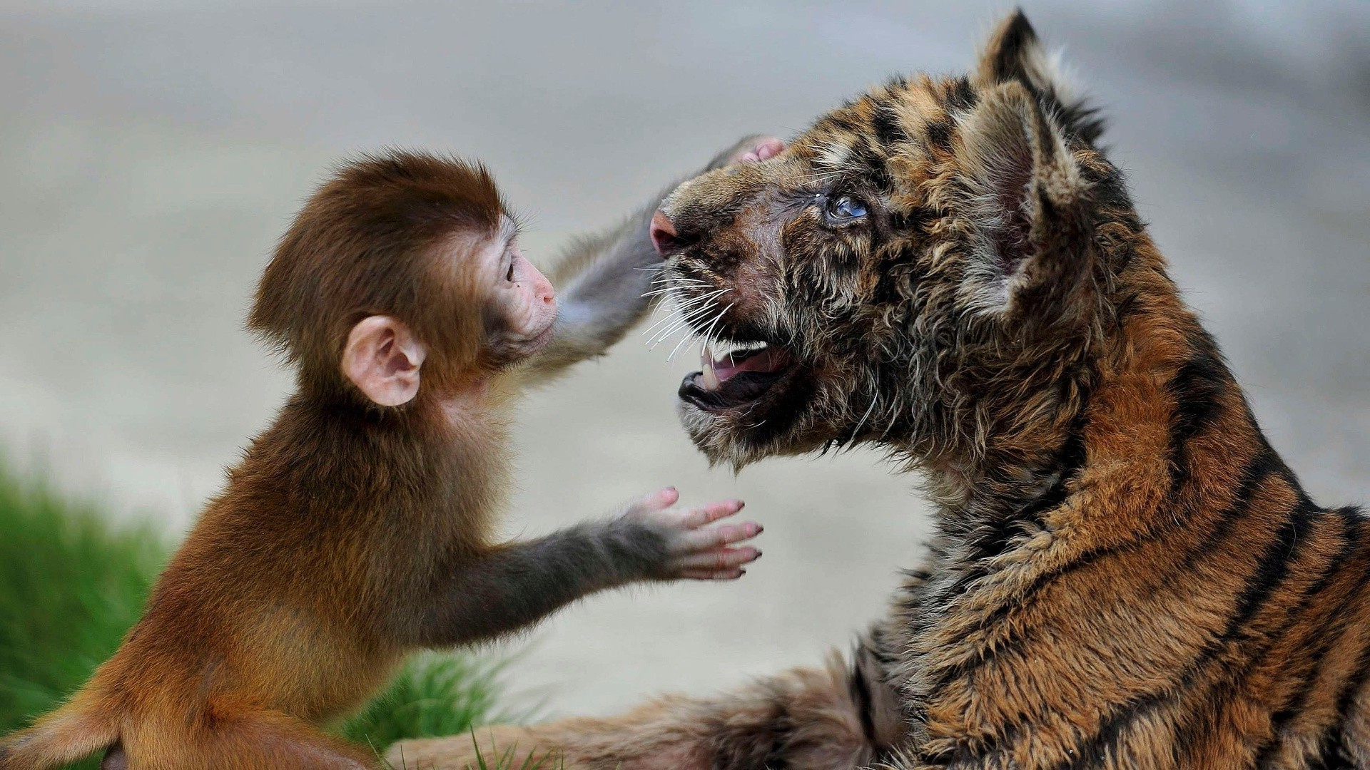 Little monkey petting tiger