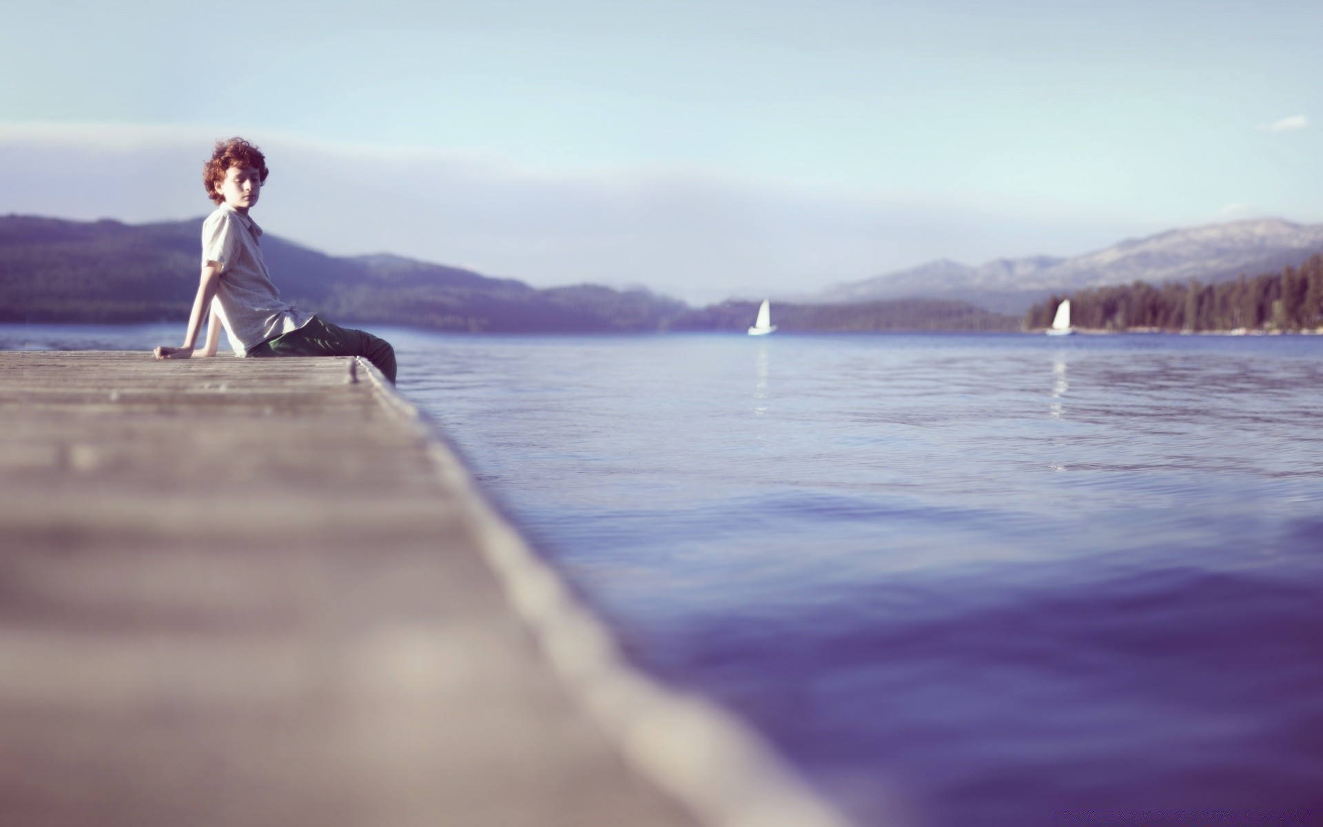 A lonely boy is sitting on the dock