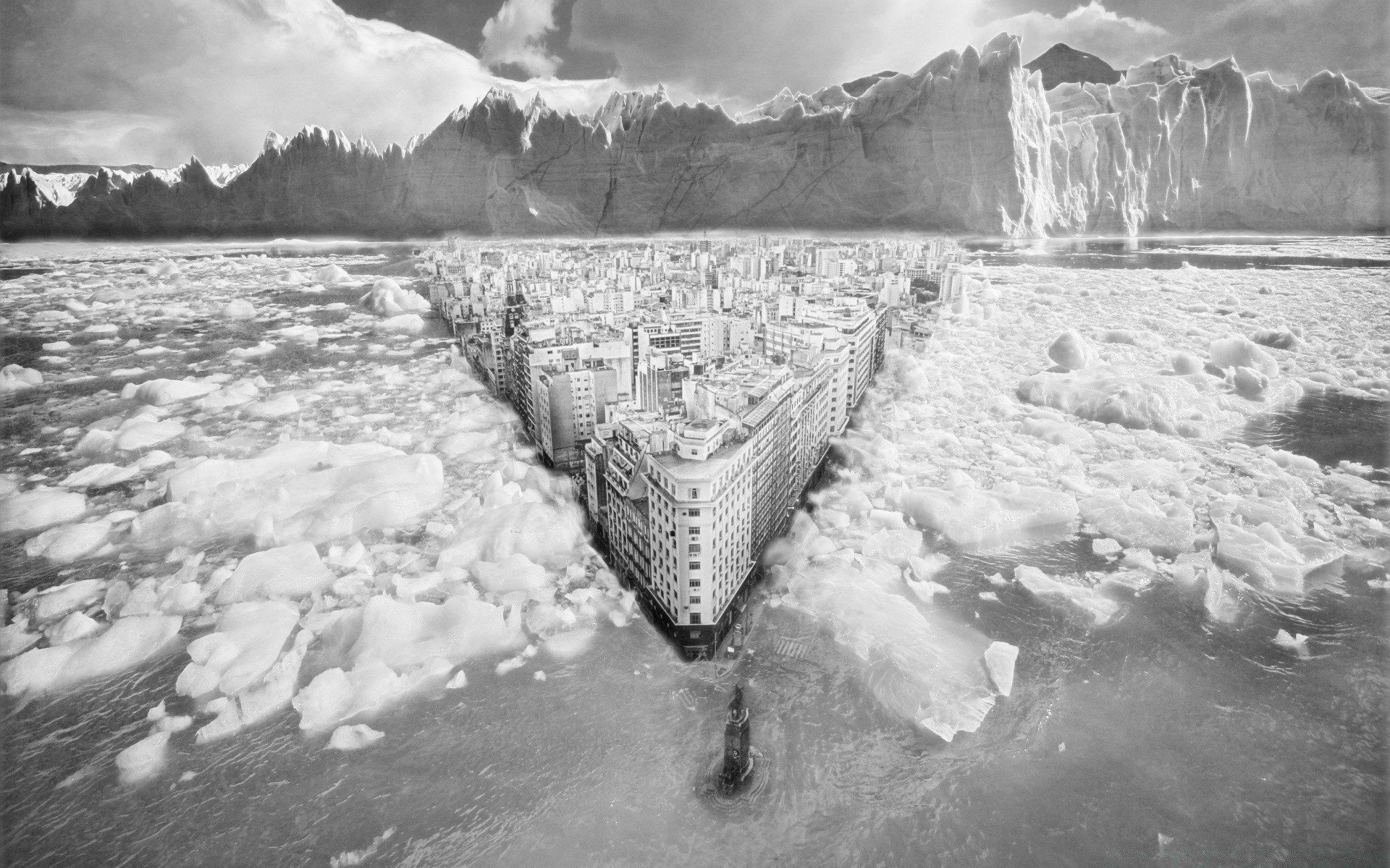 A lonely city among blocks of ice