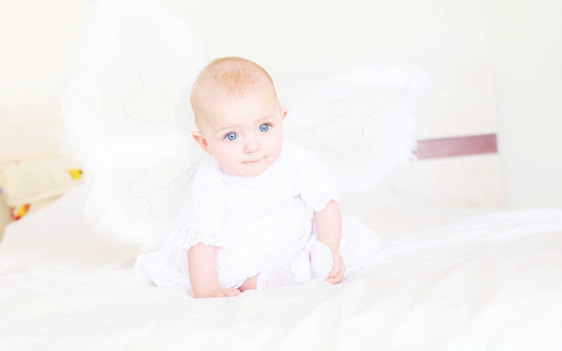 The baby looks like an angel into the distance