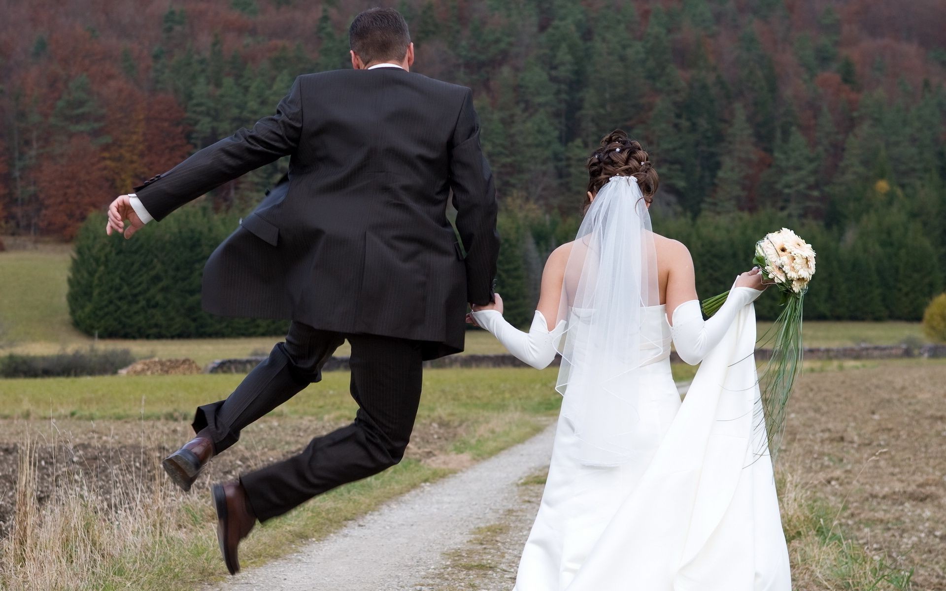 The newlyweds' walk. The man jumped for joy