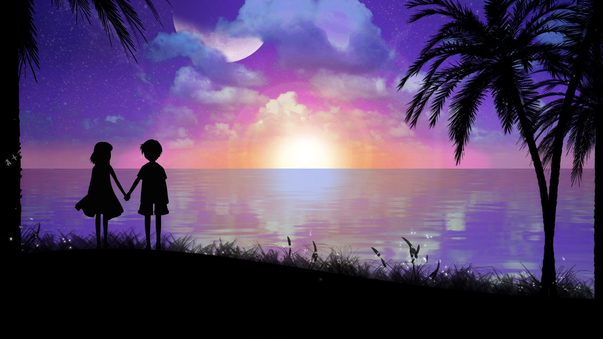 A couple in love meets the sunrise on the beach under palm trees by the sea