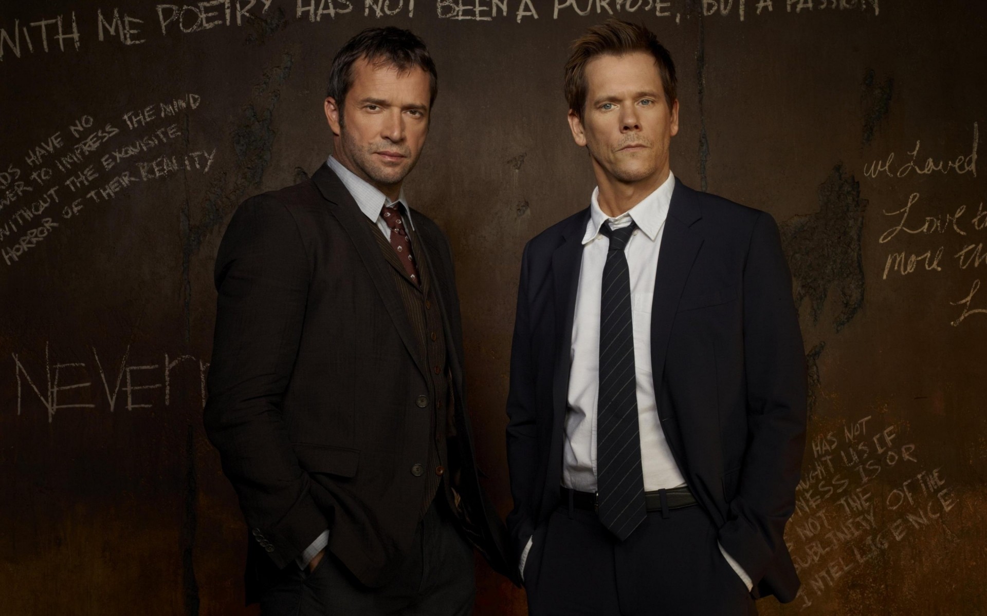 Black and white faces of two men and bright pink English letters