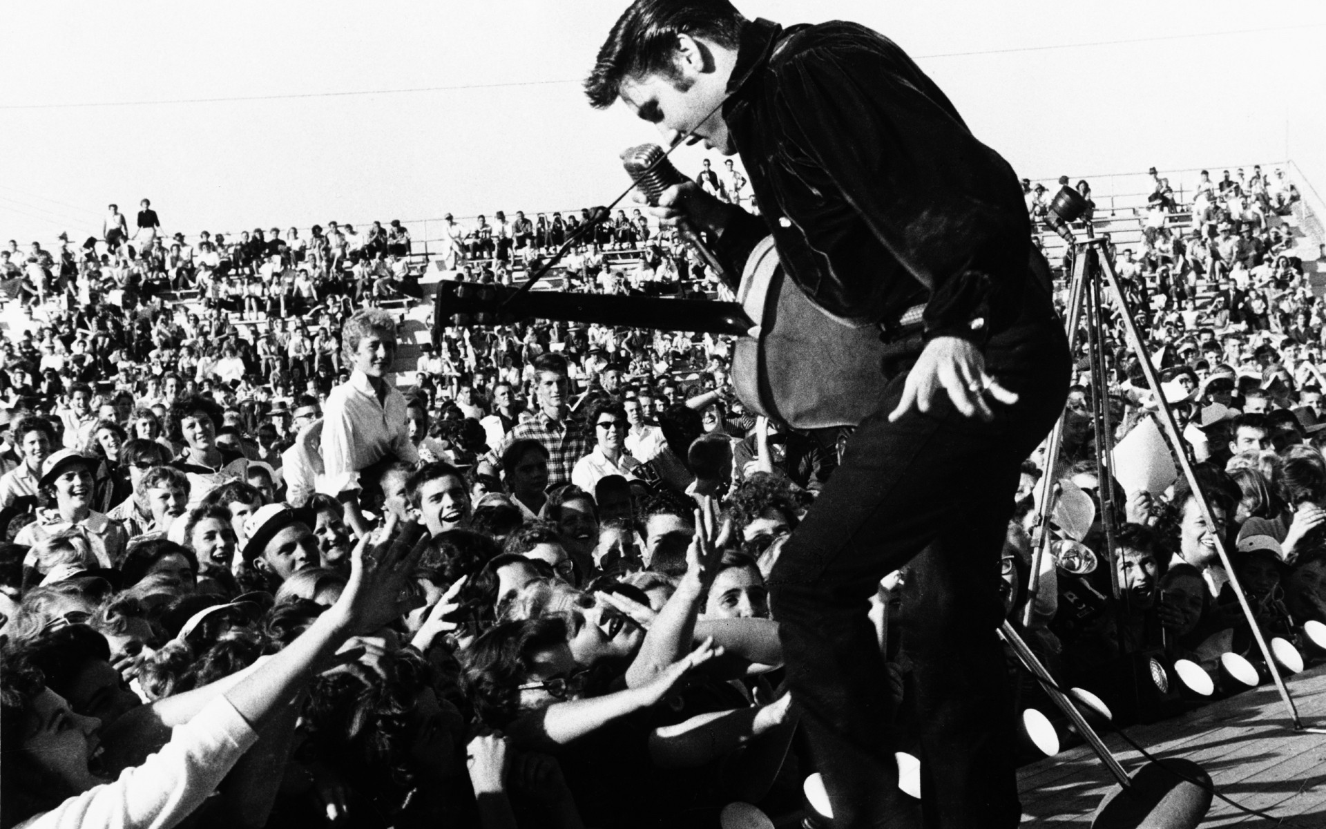 A dark-haired performer in a leather jacket and glasses sings into a microphone