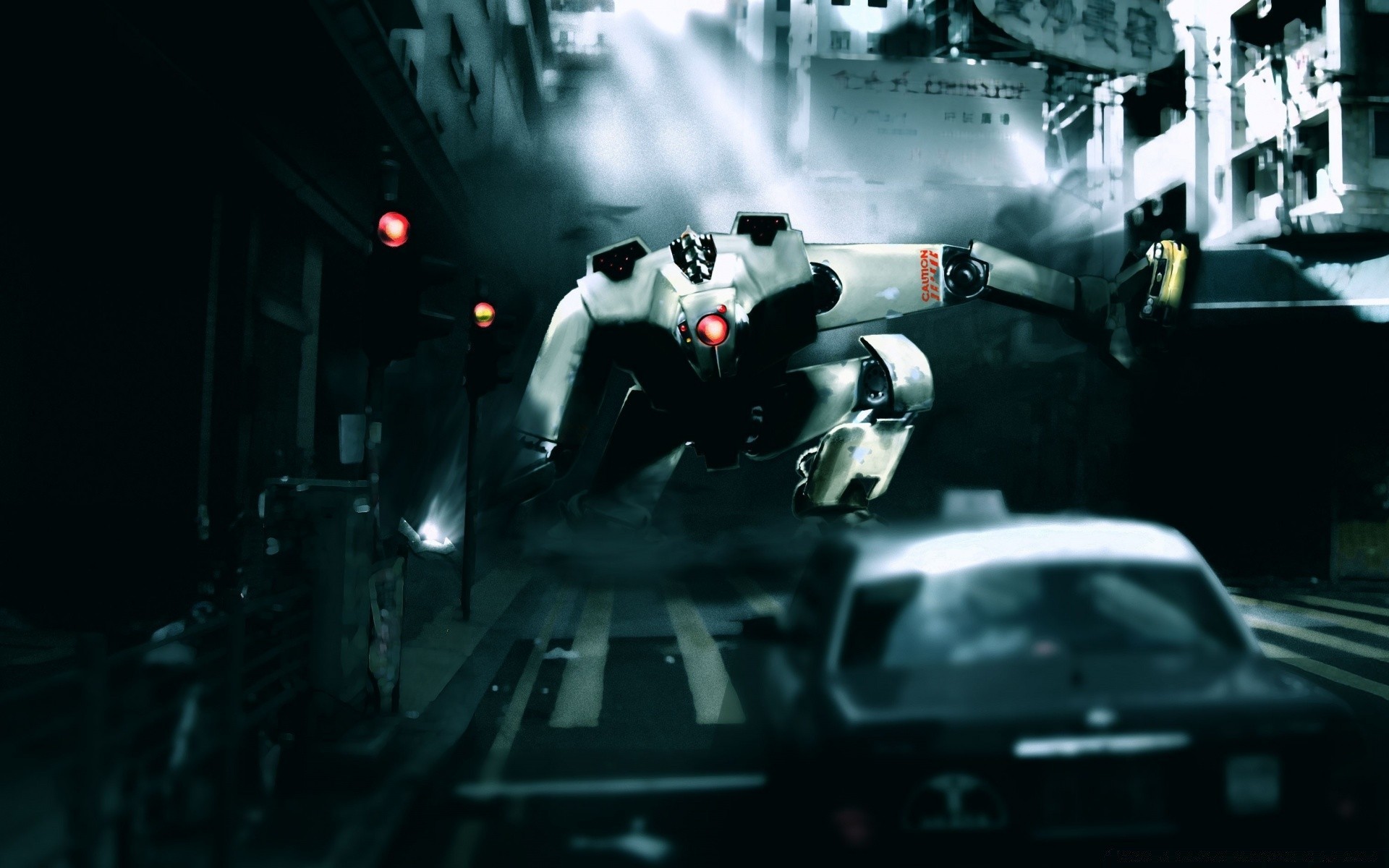 Huge military rusty robot attacks