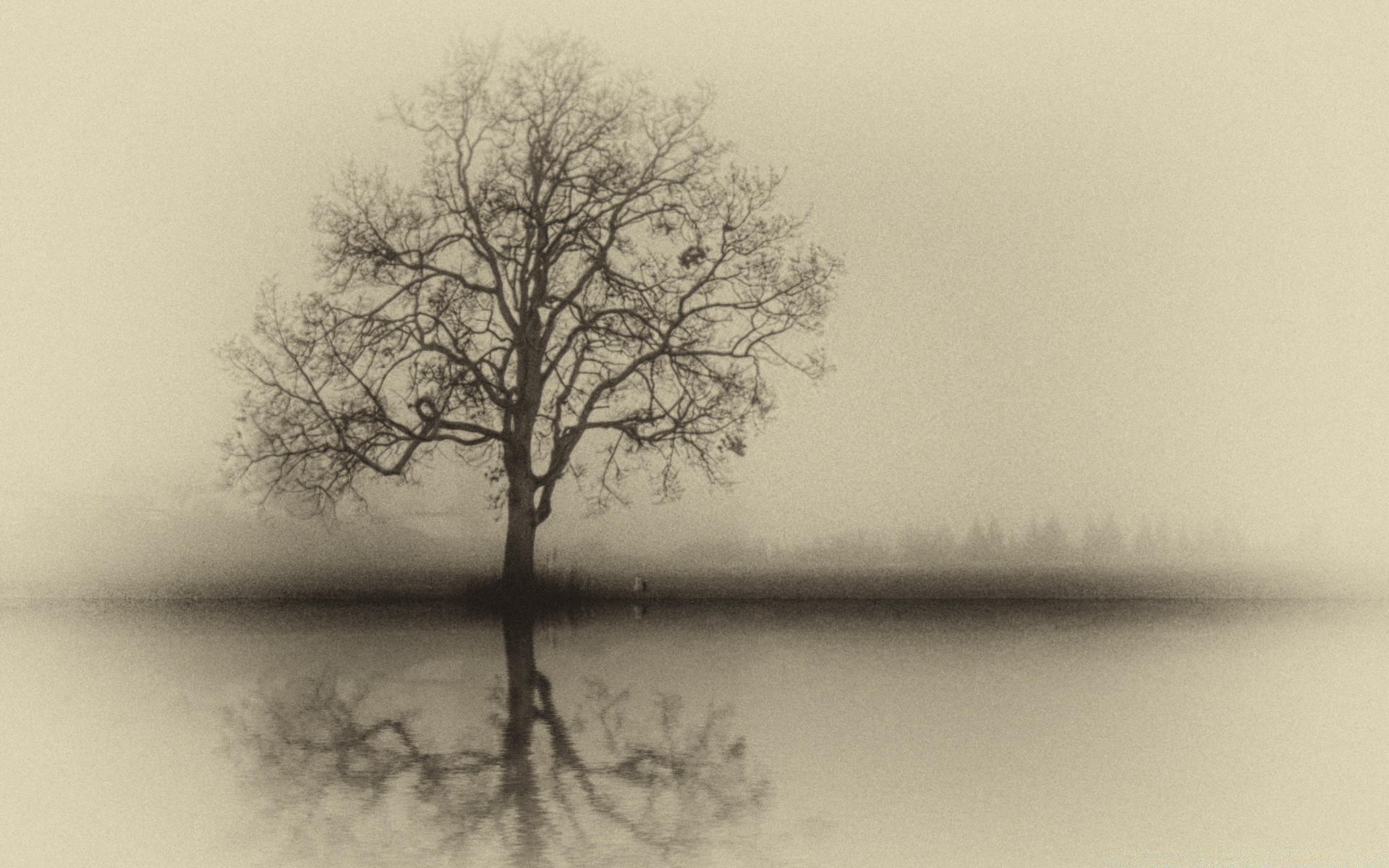 A lonely tree in the fog, classic black and white versionA lonely tree in the fog, classic black and white version