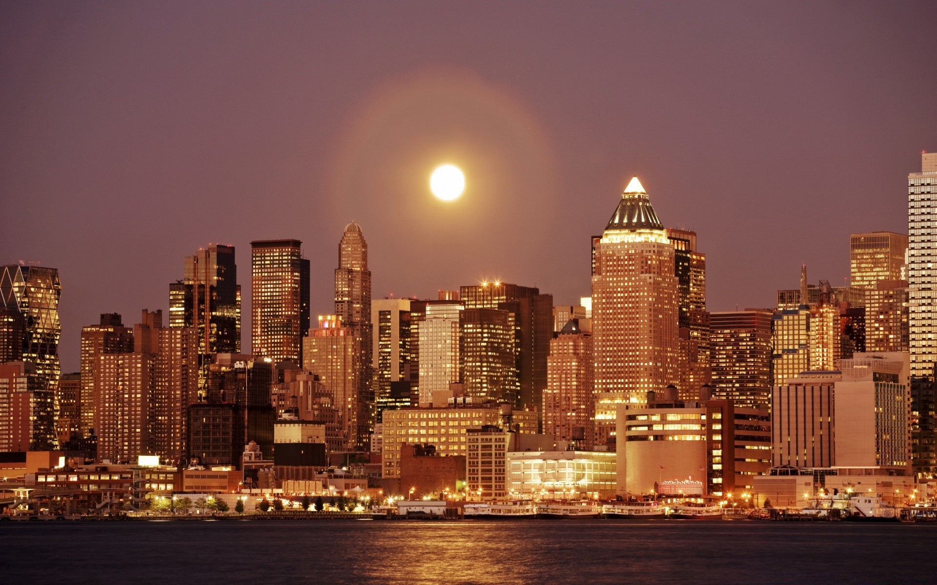 The architecture of the city at sunset. Reflection of the sky in the water during the journey