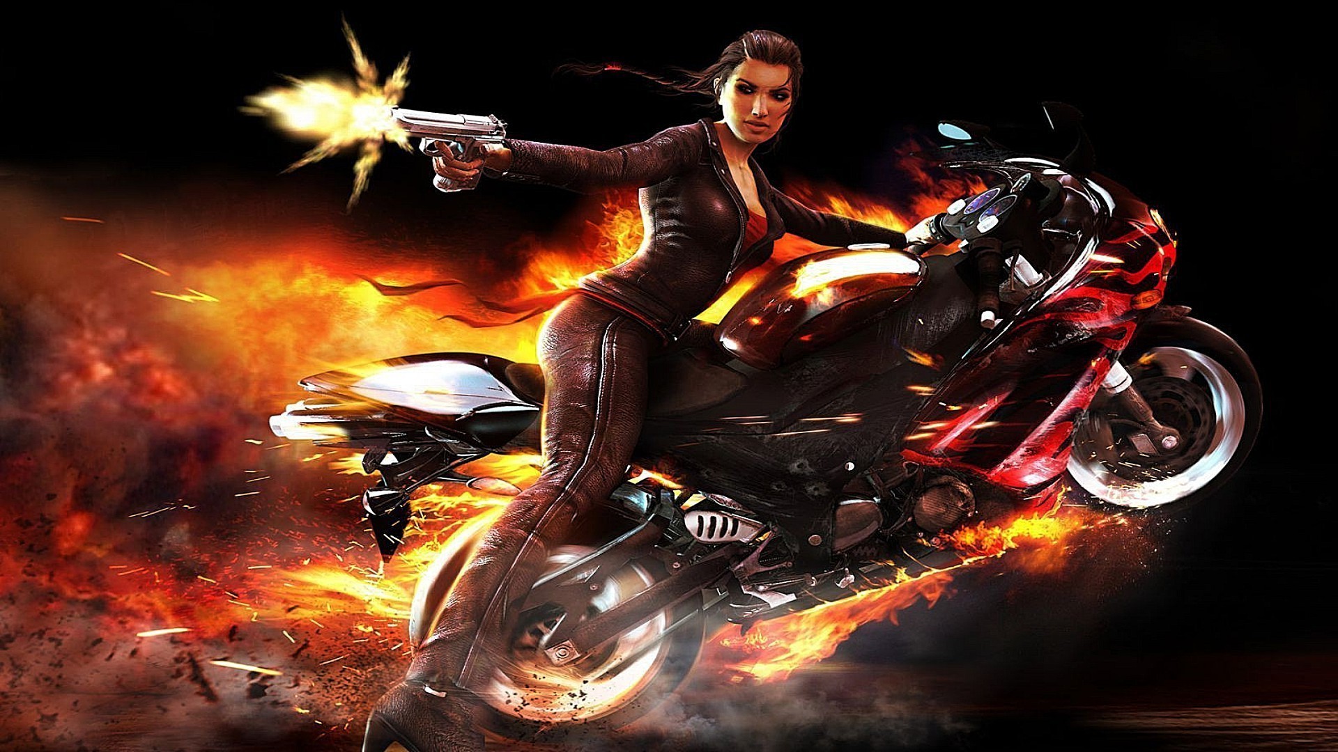 Anne Hathaway as Catwoman. A girl in latex sitting on a motorcycle