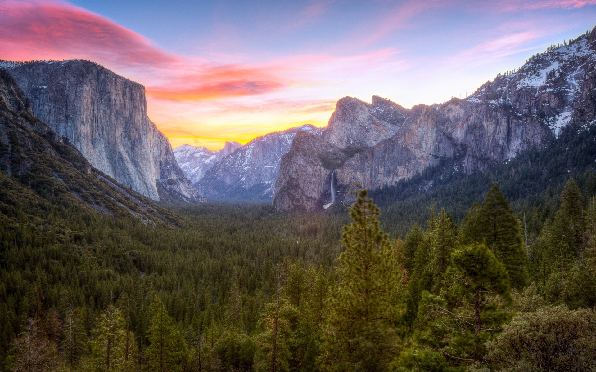 A waterfall was running from the mountains at sunset