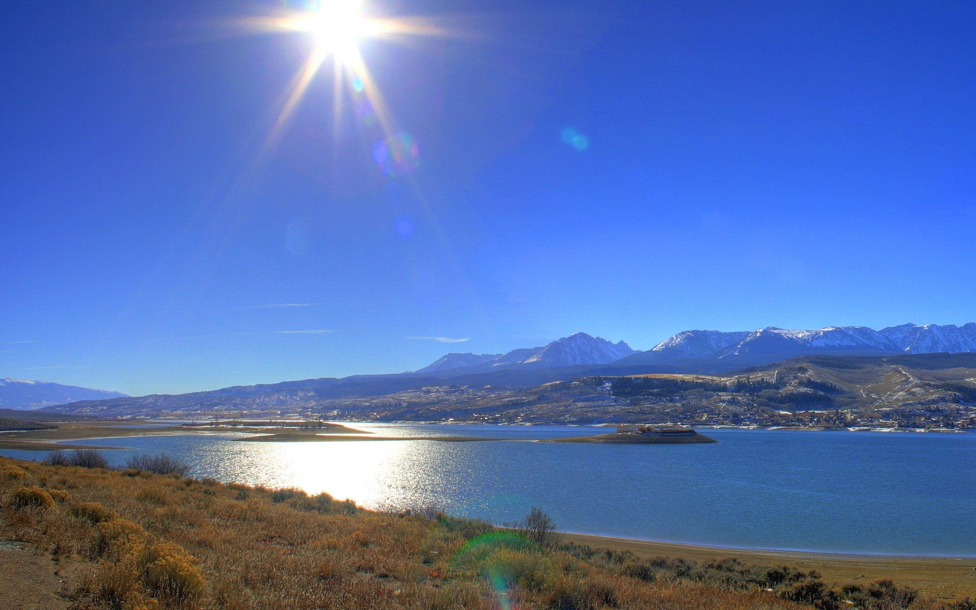 The grassy shore of a beautiful lake