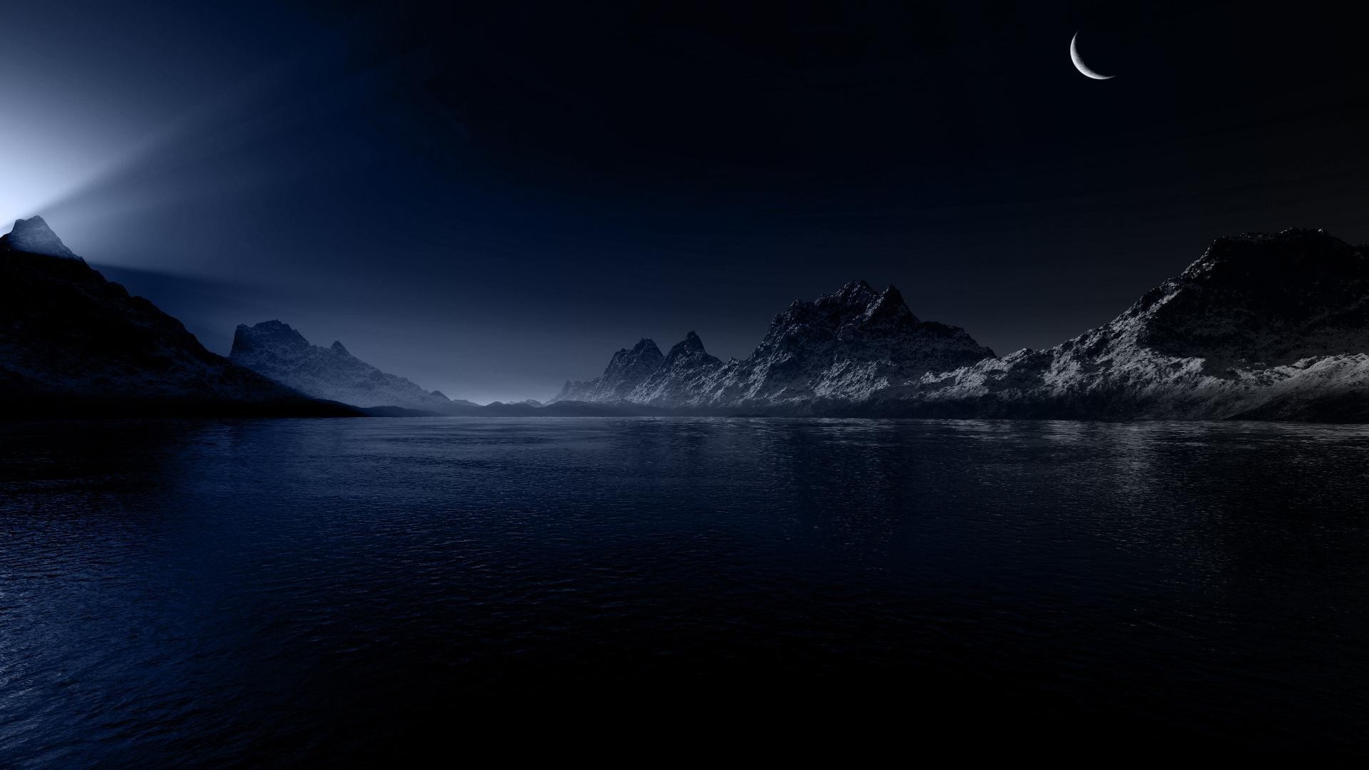 A large lake with mountains behind