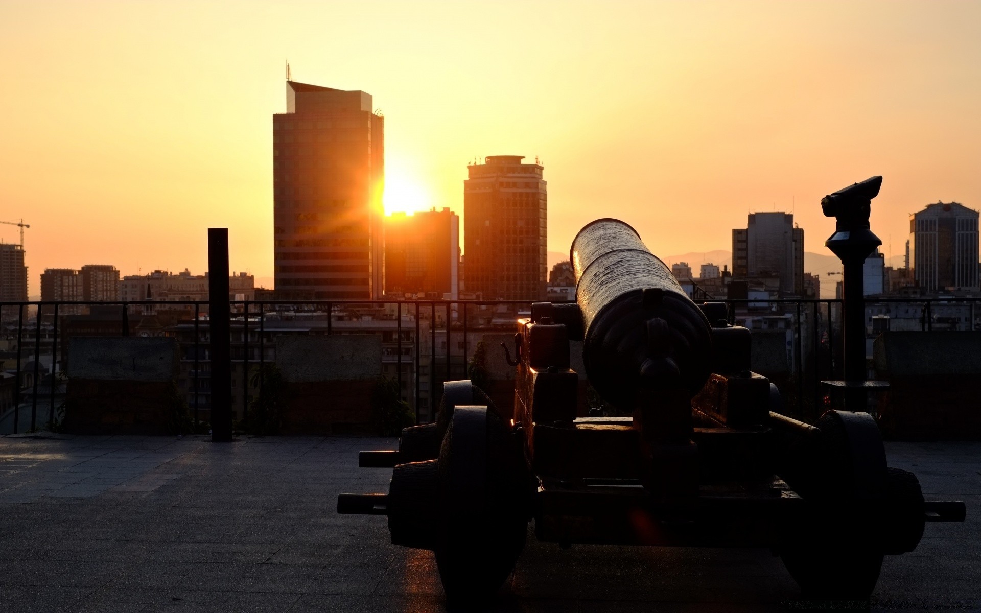 Urban landscape with high-rise buildings on the background of sunset