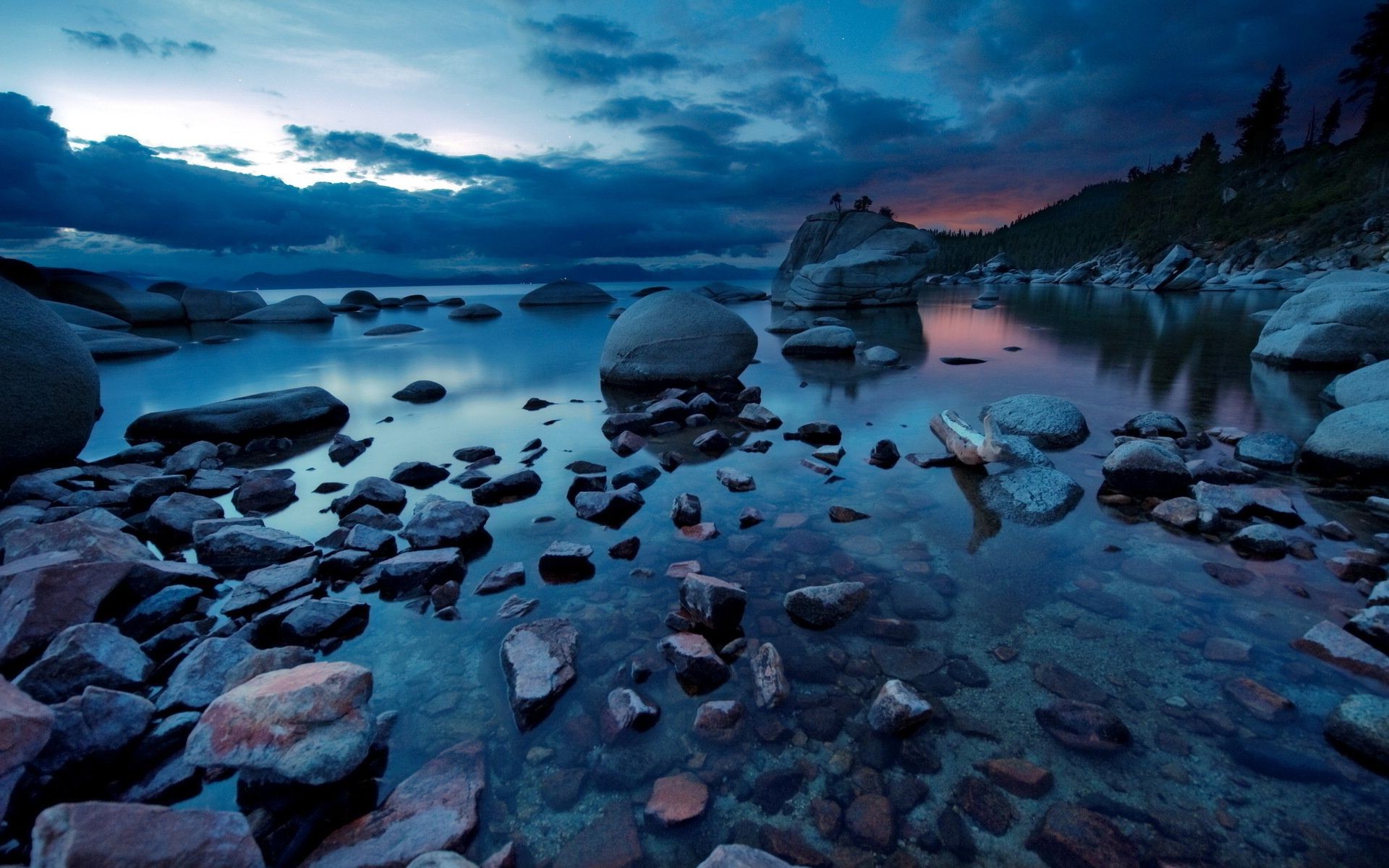 View of the night lake with pebbles