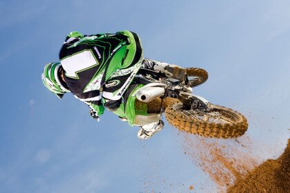 The rider takes off on a bike above the flags